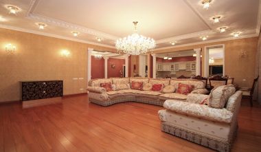 Отделка квартиры выполнена в классическом стиле. Планировочным решением предусмотрены: просторная гостиная-столовая с зоной кухни, 3 спальни, 3 гардеробные, 4 санузла.