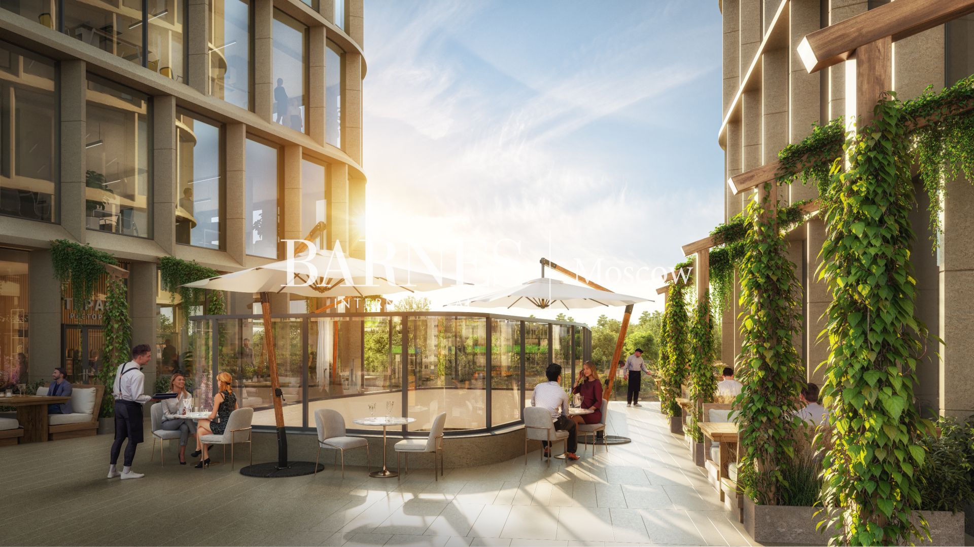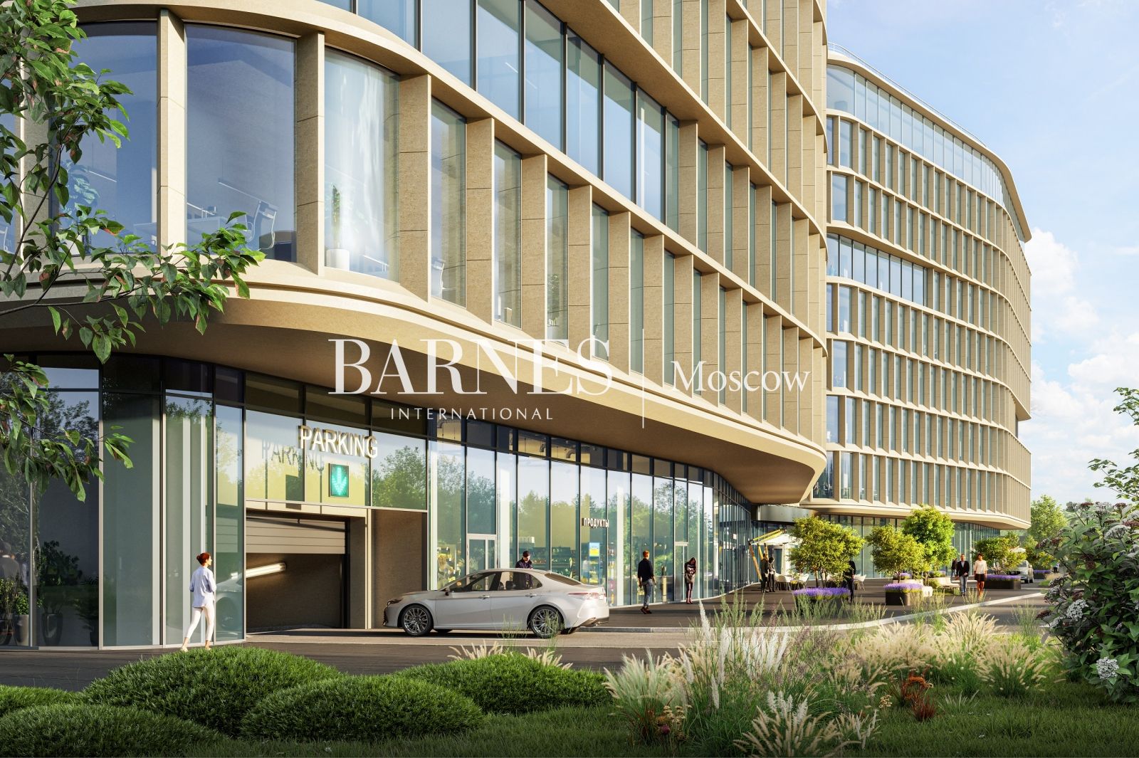 Новый бизнес-центр класса А расположится в районе Кунцево в парковой зоне на западе Москвы. До станции метро Кунцевская всего 2 минуты. Удобный выезд на Рублевское шоссе и Кутузовский проспект. Первый этаж - стилобат, который объединяет два корпуса бизнес-центра, торговые зоны, общий ресепшн. бизнес-центра. Второй этаж Корпуса 2 - фитнес, столовая.