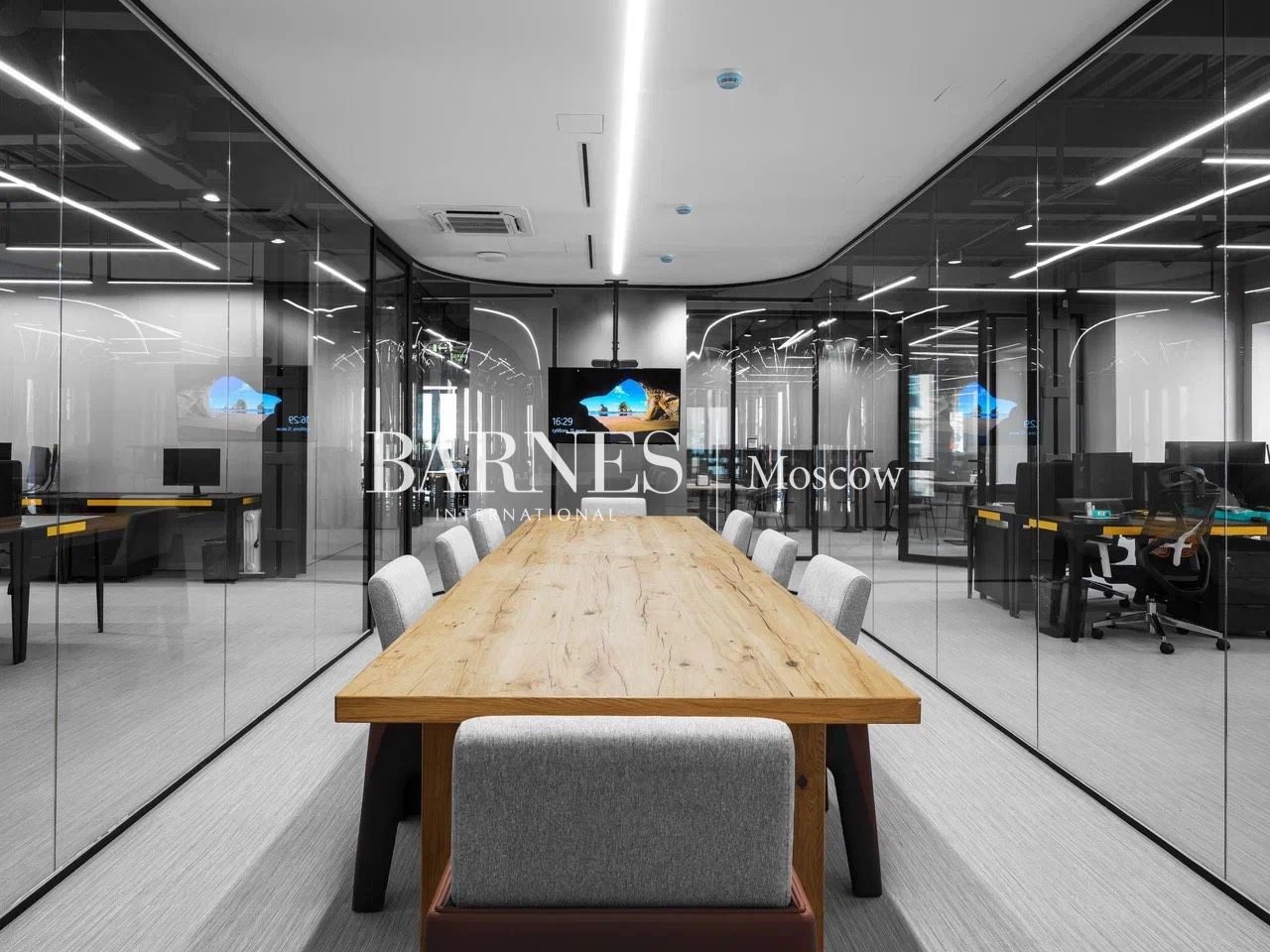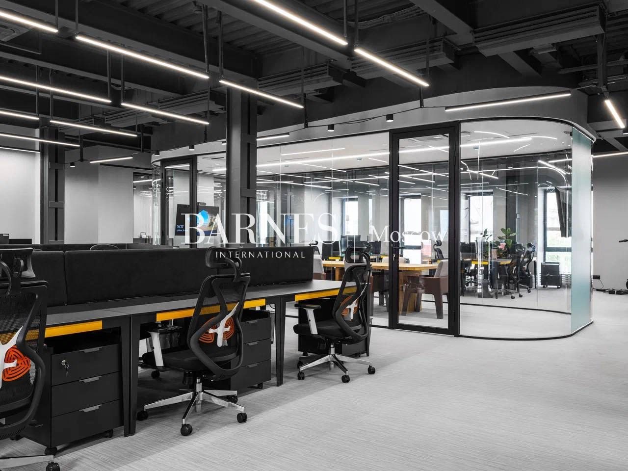 - 100 м² приватная терраса с видом на центр Москвы. - Панорамное остекление, дизайнерская отделка. - Лобби, event‑зона, переговорные, open space, кабинеты руководства. - Кофе‑зоны, кухни, медиа‑пространство, Skype‑будки, ресепшен, современная мебель.
