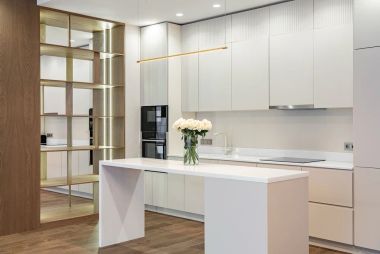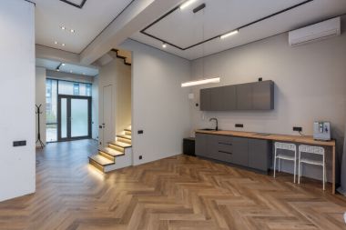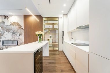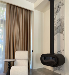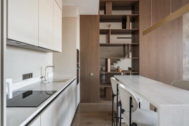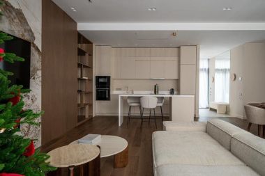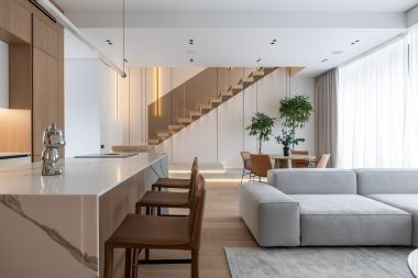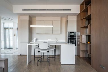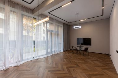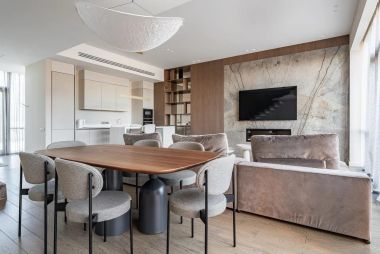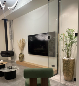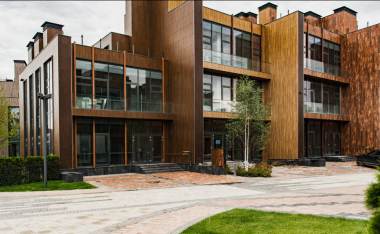 Фасады зданий в поселке “Футуро Парк” выполнены из прочных HPL-панелей с покрытием “под дерево”. Также установлены панорамные окна от пола до потолка с алюминиевым профилем.