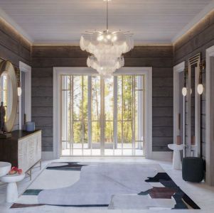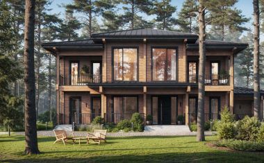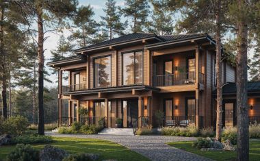 Выполненные из деревянного бруса увеличенного размера, виллы формируют единый природно-архитектурный ансамбль поселка. Деликатные теплые оттенки дерева фасадов идеально сочетаются с зеленым массивом окружающего их леса.