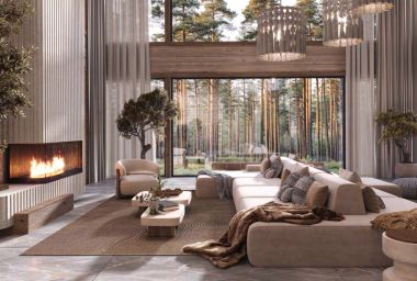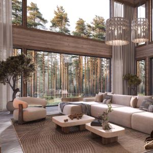 Внешние границы стирает панорамное остекление, через которое лес проникает в сердце каждого дома, наполняя каждый его уголок своим светом, красками и настроением. Видами леса можно насладиться даже из травяной парной.