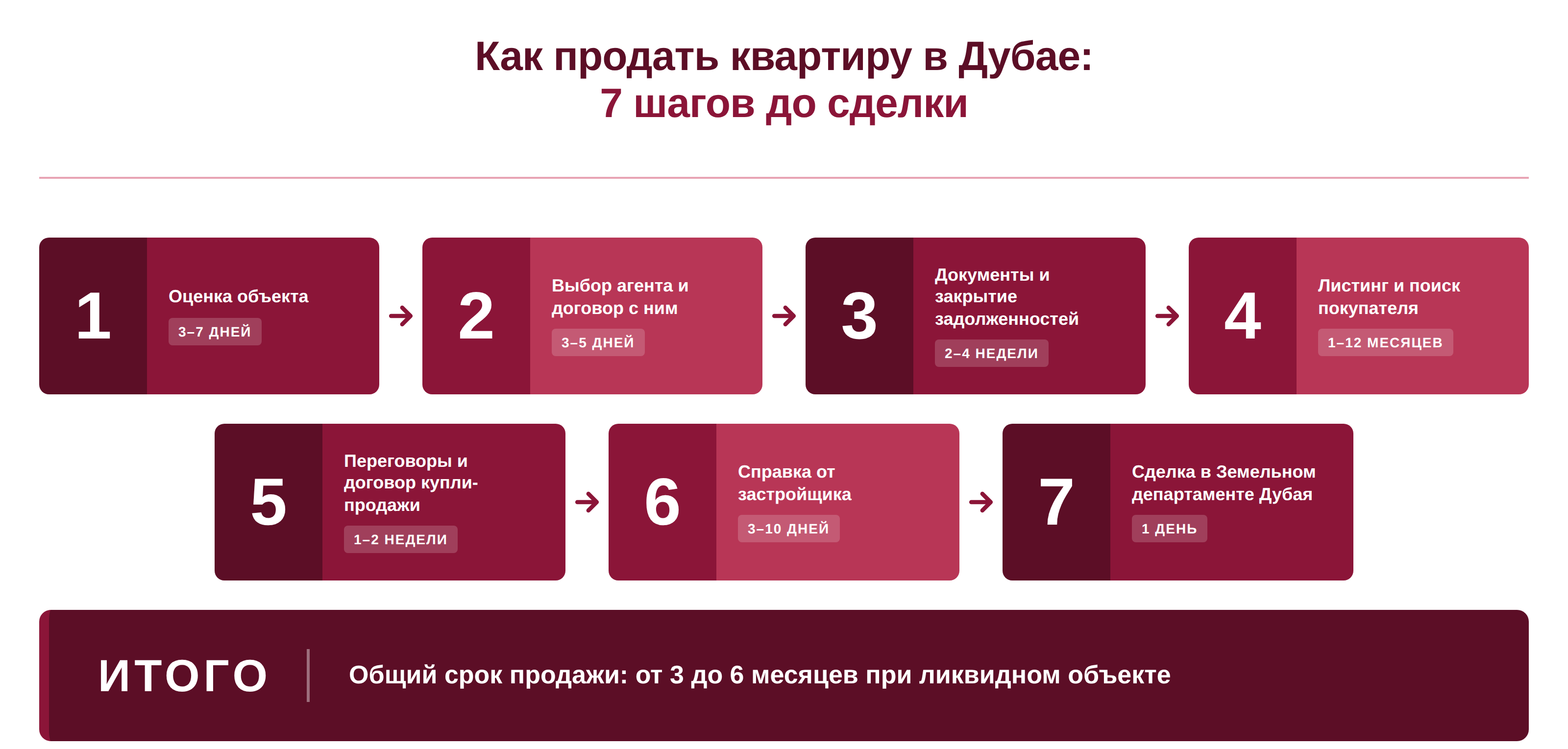 Сроки поиска покупателя зависят от района и типа квартиры. В премиальных локациях — таких как Палм-Джумейра, Даунтаун Дубай, Дубай-Хиллс-Эстейт — спрос стабильный, и ликвидная квартира с адекватной ценой находит покупателя за 2–3 месяца.