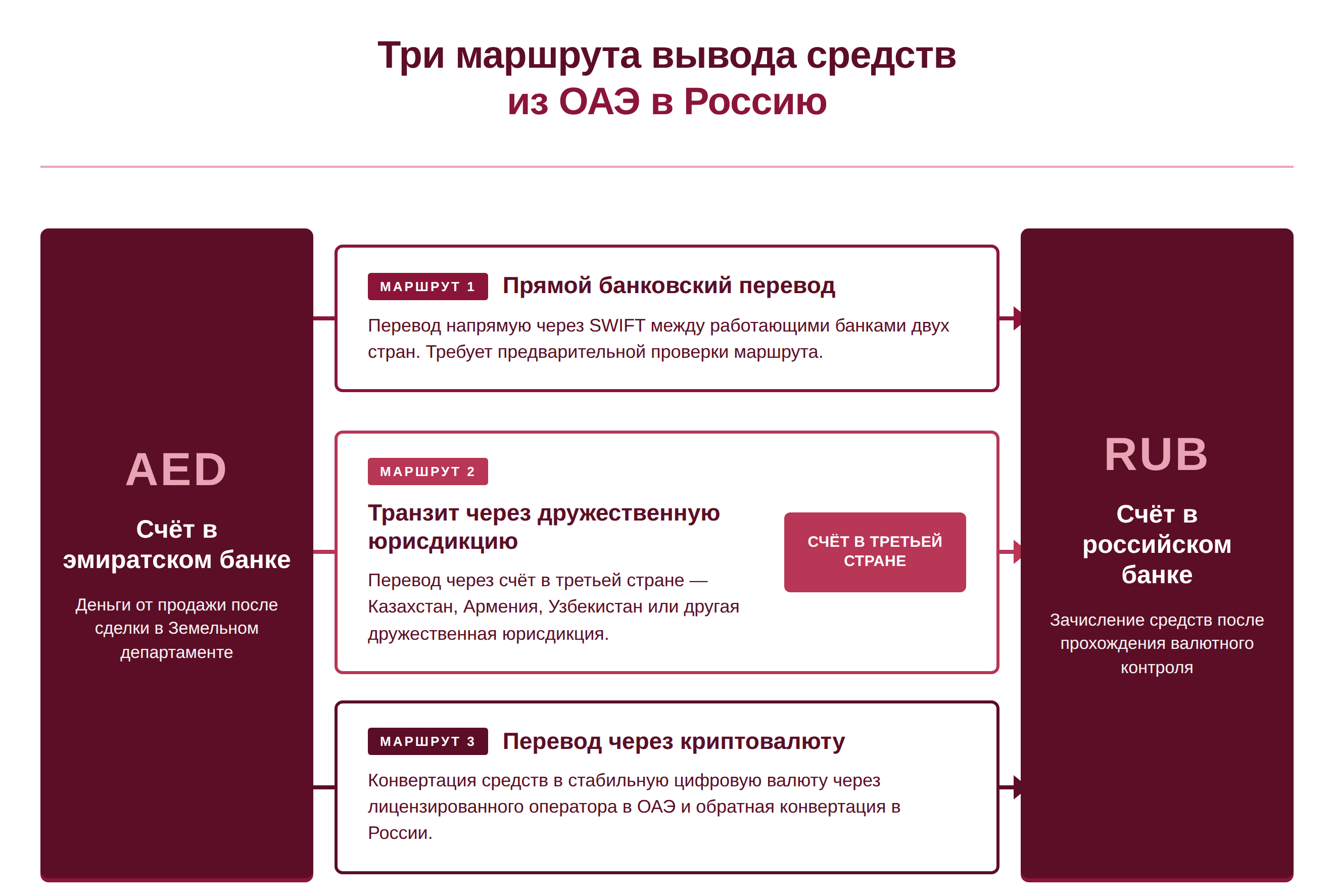 Транзит через счет в банке дружественной юрисдикции. Собственник открывает счет в стране, с которой у российских банков сохранились прямые корреспондентские отношения — например, в Казахстане, Армении, Узбекистане. Деньги приходят туда из эмиратского банка, а затем переводятся на российский счет. Этот маршрут дольше, но обходит многие ограничения прямого пути.