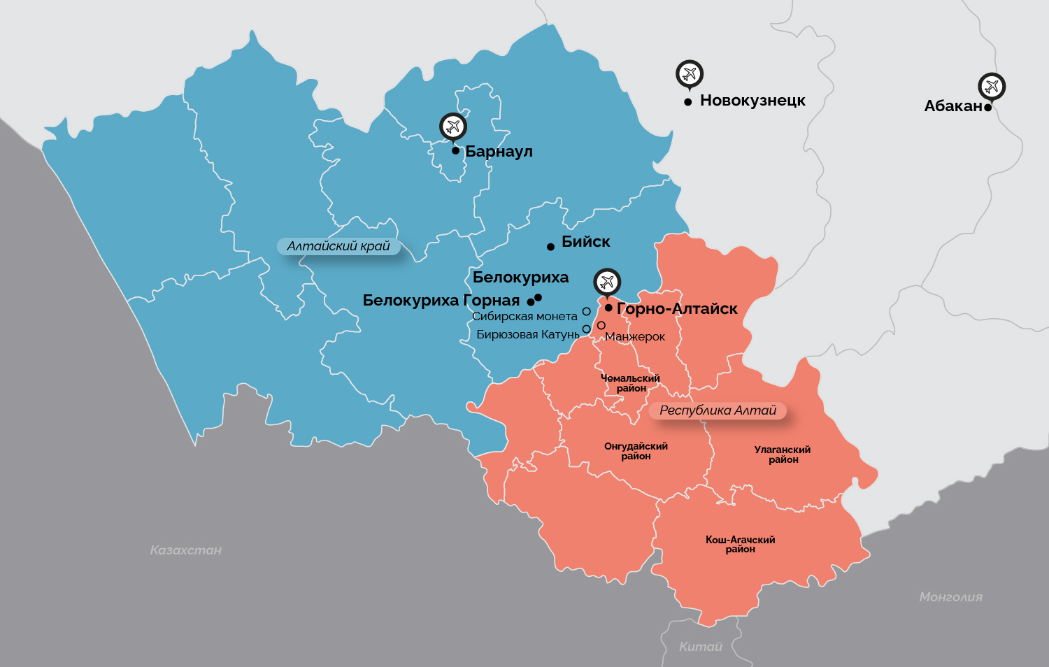 Ключевые локации Алтайского края — это Белокуриха с федеральными здравницами, новый горнолыжный кластер Белокуриха Горная, игорная зона «Сибирская монета» и особая экономическая зона «Бирюзовая Катунь». Каждая предлагает развитую инфраструктуру под разные цели путешественников.