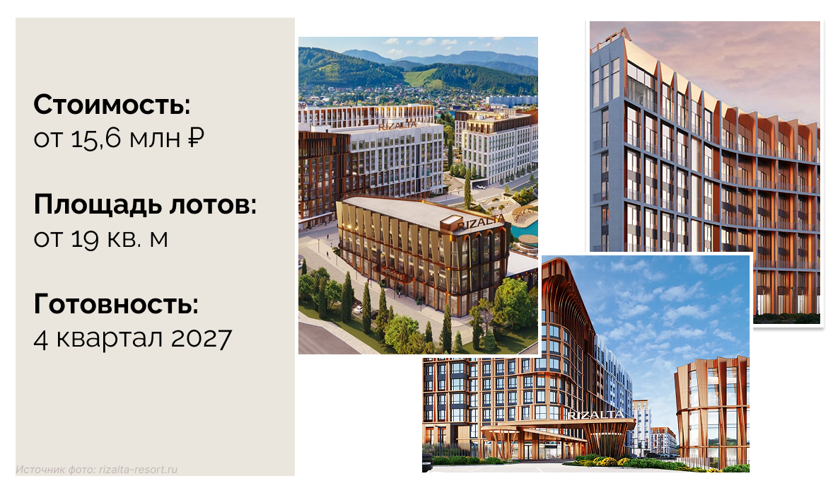 Апарт-отель Rizalta Resort Belokurikha — арендный доход на курорте с 80-летней историей и высокой загрузкой. Отели Белокурихи заняты на 85% круглый год за счет лечебных программ и термальных источников. Три корпуса для разной аудитории расширяют базу арендаторов, проект окупится за шесть лет. Подходит тем, кто ищет предсказуемый доход в проверенной локации.