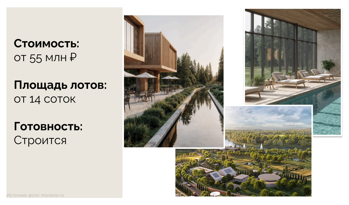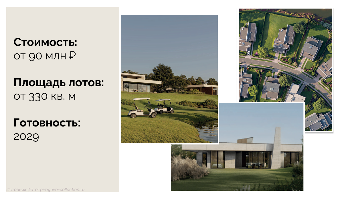 В проекте можно купить дома площадью от 331 до 840 кв. м. Из окон будут открываться панорамные виды на гольф-поле и лес, архитектурная концепция проекта строится на сочетании природы, приватности и низкой плотности застройки. Сдача коттеджного поселка со всей инфраструктурой запланирована на 2029 год.