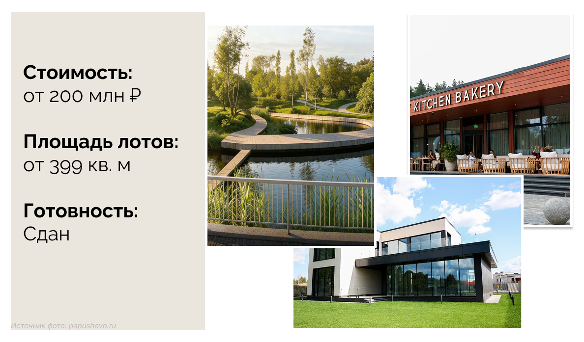 Папушево парк — премиальный коттеджный поселок на территории в 180 га с ландшафтными парками, площадками для занятий спортом и досугово-развлекательным центром.