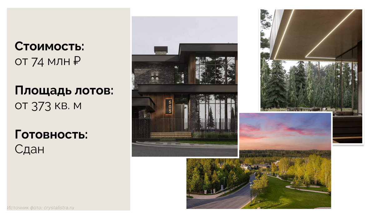 | Стоимость от, млн руб | Участки — 65, дома — 200 | 74 | 285 | 55 | 90 |