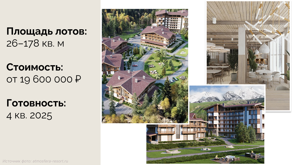 Проект интересен инвесторам, которые хотят зарабатывать на посуточной аренде. Строительство закончат до конца 2025 года, с 2026 уже можно получать пассивный доход от сдачи. Плановая годовая загрузка Атмосфера Resort Residence — от 255 дней, доходность — от 2,5 млн рублей.