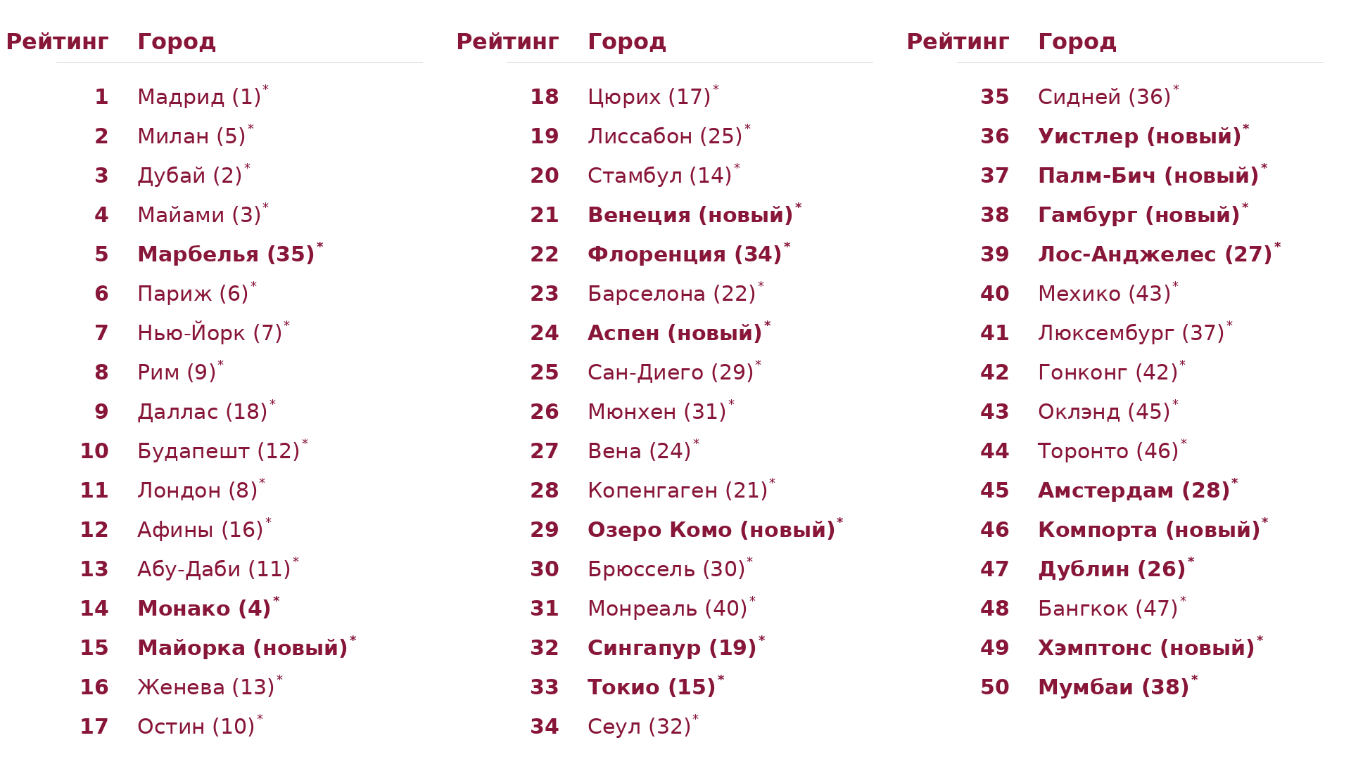 Жирным выделены города, которые поднялись или опустились более чем на 10 позиций за год. В скобках — позиция в рейтинге 2025 года.