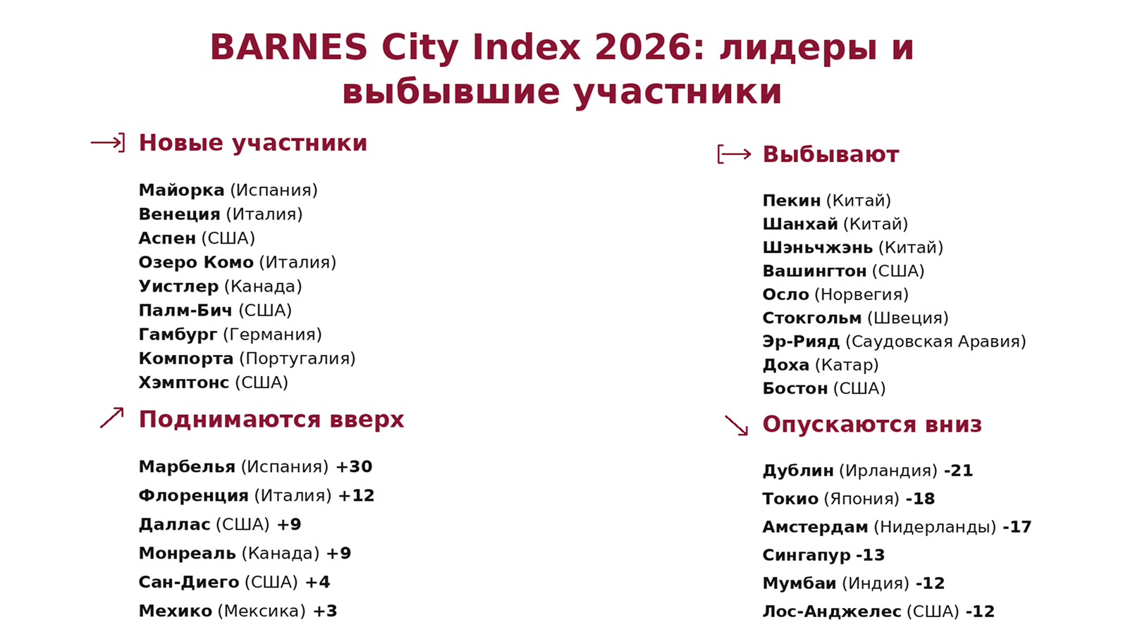 Из рейтинга выбыли Пекин, Шанхай, Шэньчжэнь, Вашингтон, Осло, Стокгольм, Эр-Рияд, Доха и Бостон. Заметно потеряли позиции Дублин, Токио, Амстердам, Сингапур, Мумбаи и Лос-Анджелес. Эта динамика показывает, что крупный масштаб и высокая деловая активность не привлекают состоятельных людей так, как раньше.