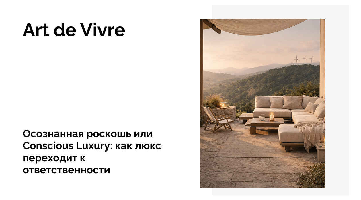 «Хорошая» роскошь XXI века — это роскошь, улучшенная этикой. Она больше не про пустое тешение эго или демонстрацию статуса — она про ценности, убеждения и вклад. Как выразился один из обозревателей, «в 2025 году высшая роскошь – это не то, что ты имеешь, а то, насколько осознанно ты живёшь».