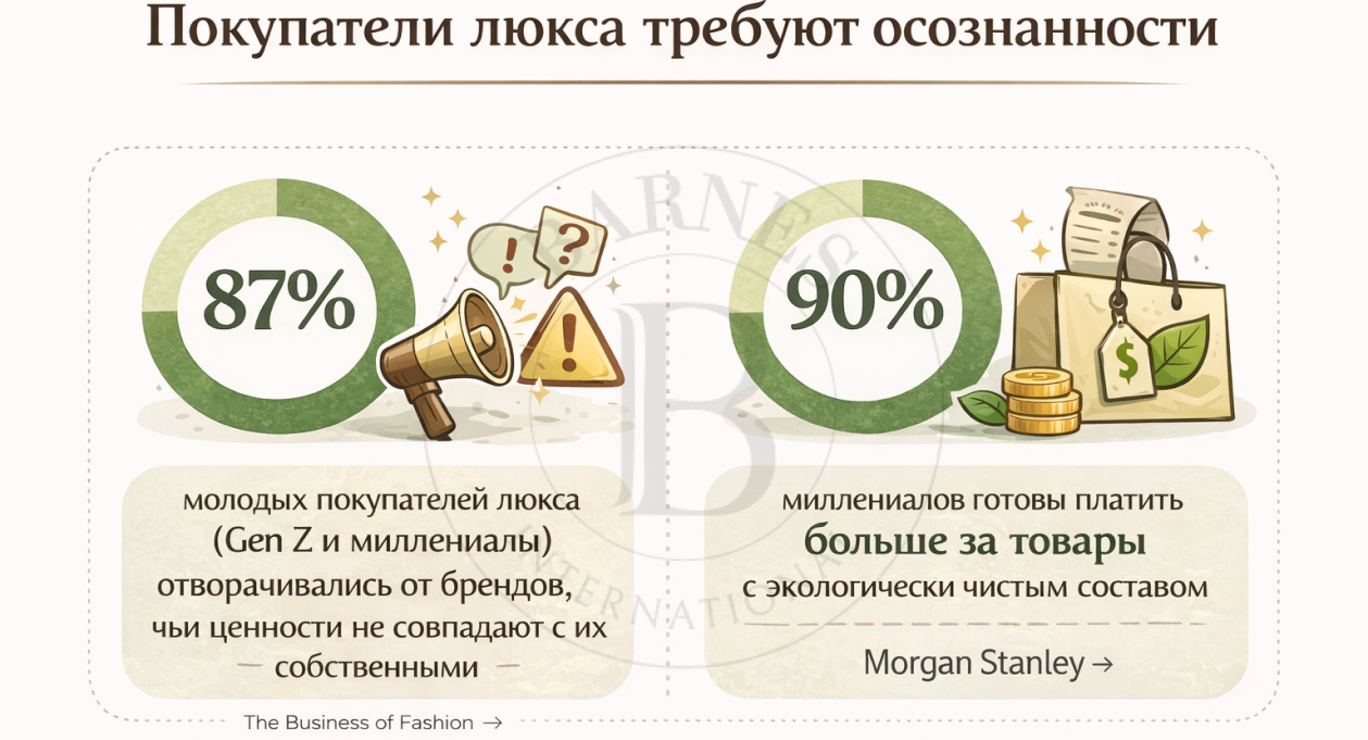 Сегодня состоятельные потребители (особенно поколения миллениалов и Z) хотят видеть в люксовых продуктах отражение своих убеждений — от экологической устойчивости до социального равенства. Так, в опросе Business of Fashion 87% молодых покупателей люкса (Gen Z и миллениалы) заявили, что отворачивались от брендов, чьи ценности не совпадают с их собственными, а по данным Morgan Stanley 90% миллениалов готовы платить больше за товары с экологически чистым составом.