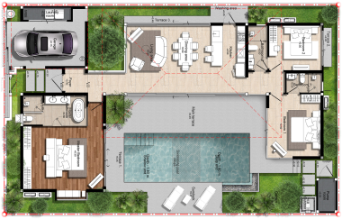 Это вилла площадью 637 кв.м., внутри современная кухня с островом/барной стойкой и три комфортабельные спальни, каждая с собственной ванной комнатой.