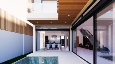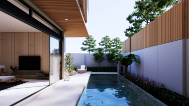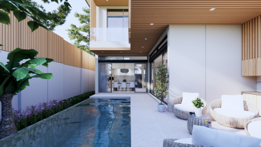 Таунхаус площадью 372 кв.м, в ней 3 спальни и 4 ванных комнат. Главная спальня оборудована собственной гардеробной. На вилле имеются гостиная и обеденная зона открытой планировки, кухня в западном стиле с островом/барной стойкой, кладовка, частный бассейн и терраса, душ на открытом воздухе, крытый навес на 2 или 3 машины.