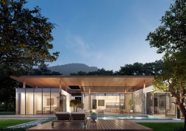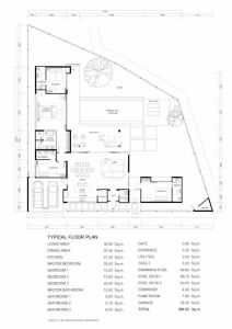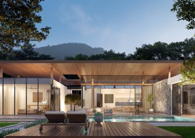 Здание L-образной формы вокруг частного бассейна обеспечивает прямой выход на террасу у бассейна из большинства частей виллы, включая главную спальню, гостиную и некоторые гостевые спальни.