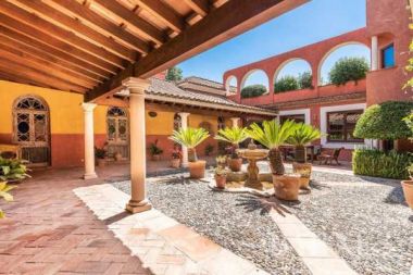 This splendid Andalucian/Oriental house is situated in the heart of Sotogrande Costa next to the Polo Fields. The interiors are rustic with a very large sitting room leading onto a pretty covered terrace and beautiful gardens. Downstairs there is also a dining room, asuperbly equipped kitchen, 2 double bedrooms en-suite, office, laundry room and staff quarters with a sitting room, bedroom, bathroom and garage. The master bedroom is upstairs with a superb bathroom including a hydromassage bath. There is an additional bedroom/dressing room and solarium with Jacuzzi. Crossing the garden from the main house, there is a delighful guest house with 2 bedrooms with en-suite bathroom, sitting room, kitchen and games room. Some features are: alarm system with cameras, heated pool and hot/cold air conditioning.