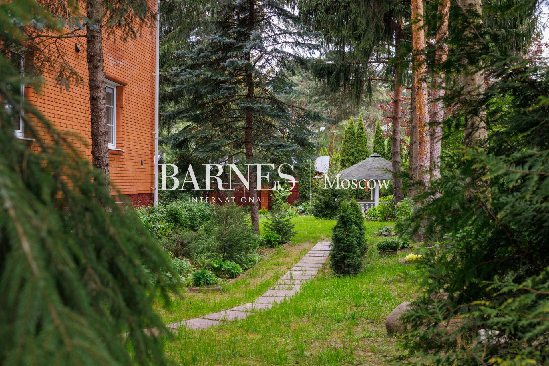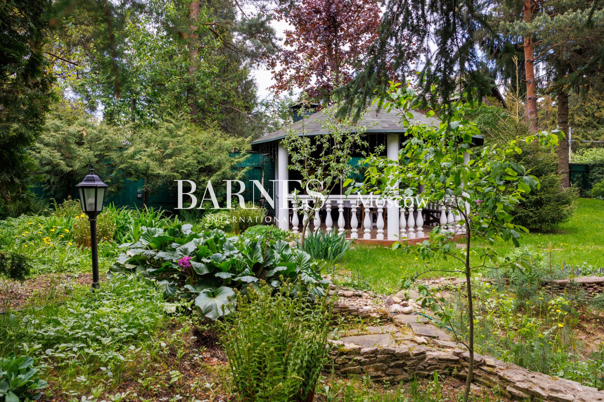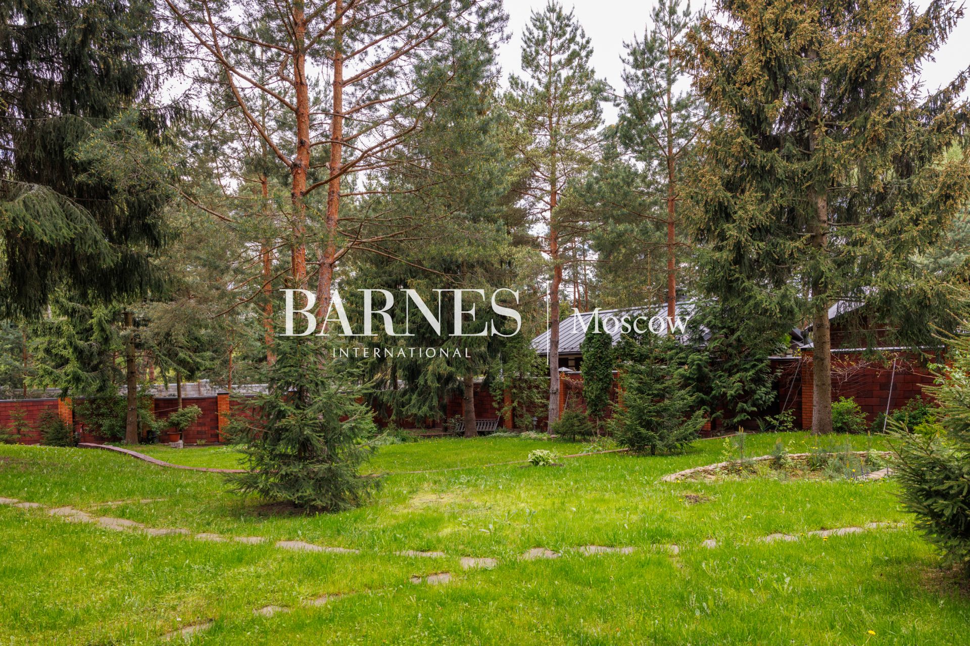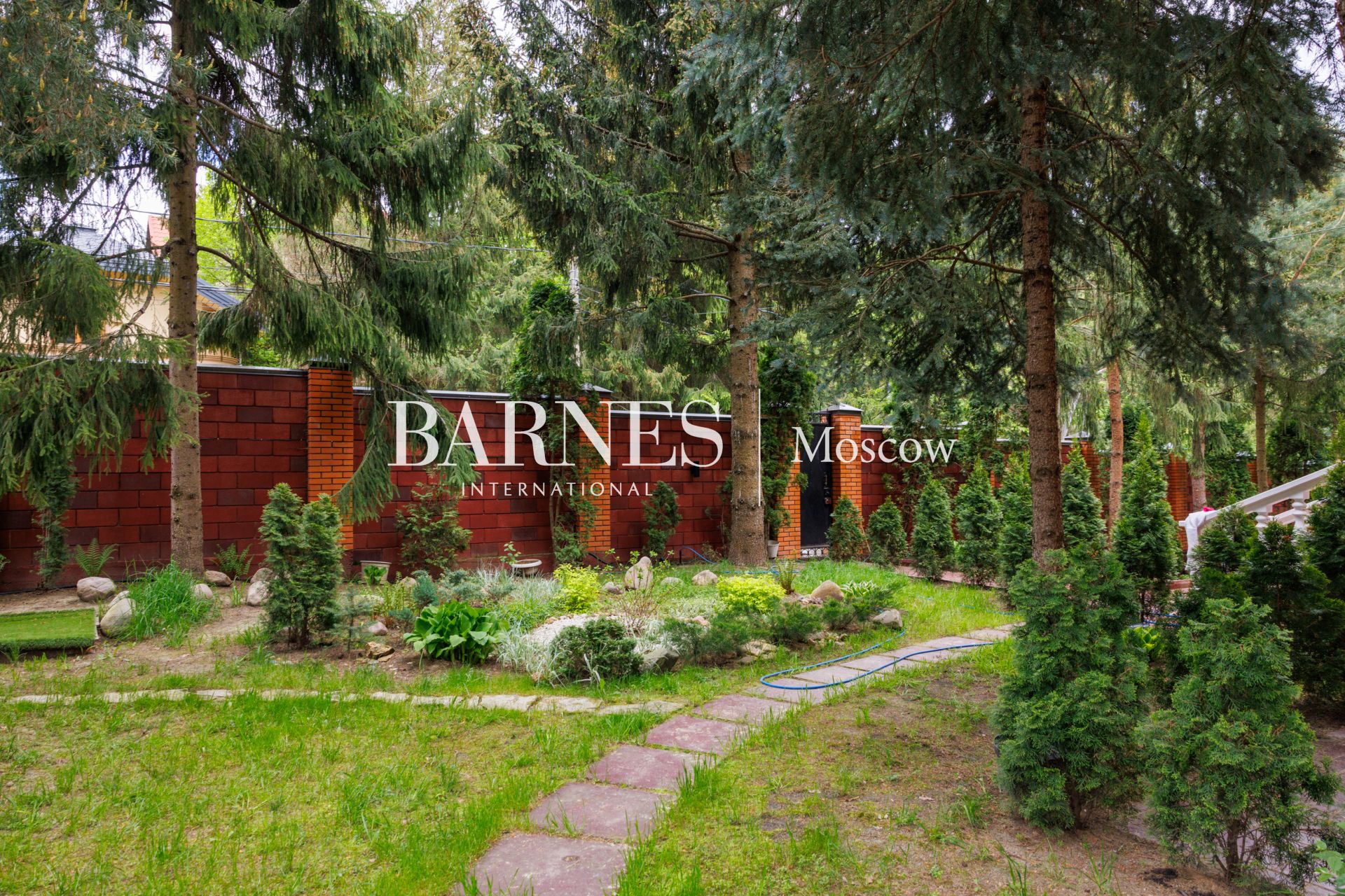 Участок приватный, с высоким забором, с множеством взрослых хвойных деревьев и ландшафтными работами: газон, дорожки, клумбы, декоративные насаждения.