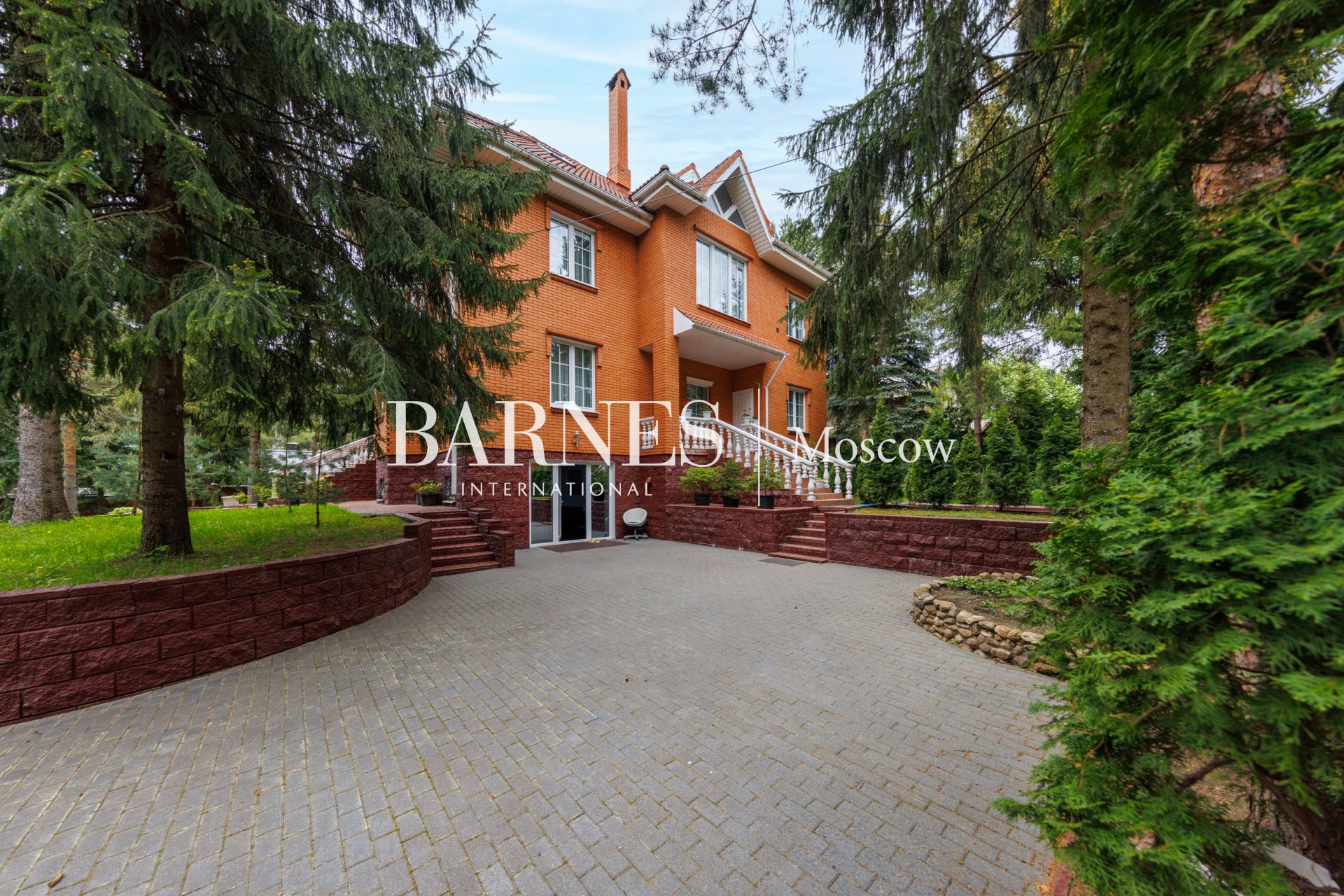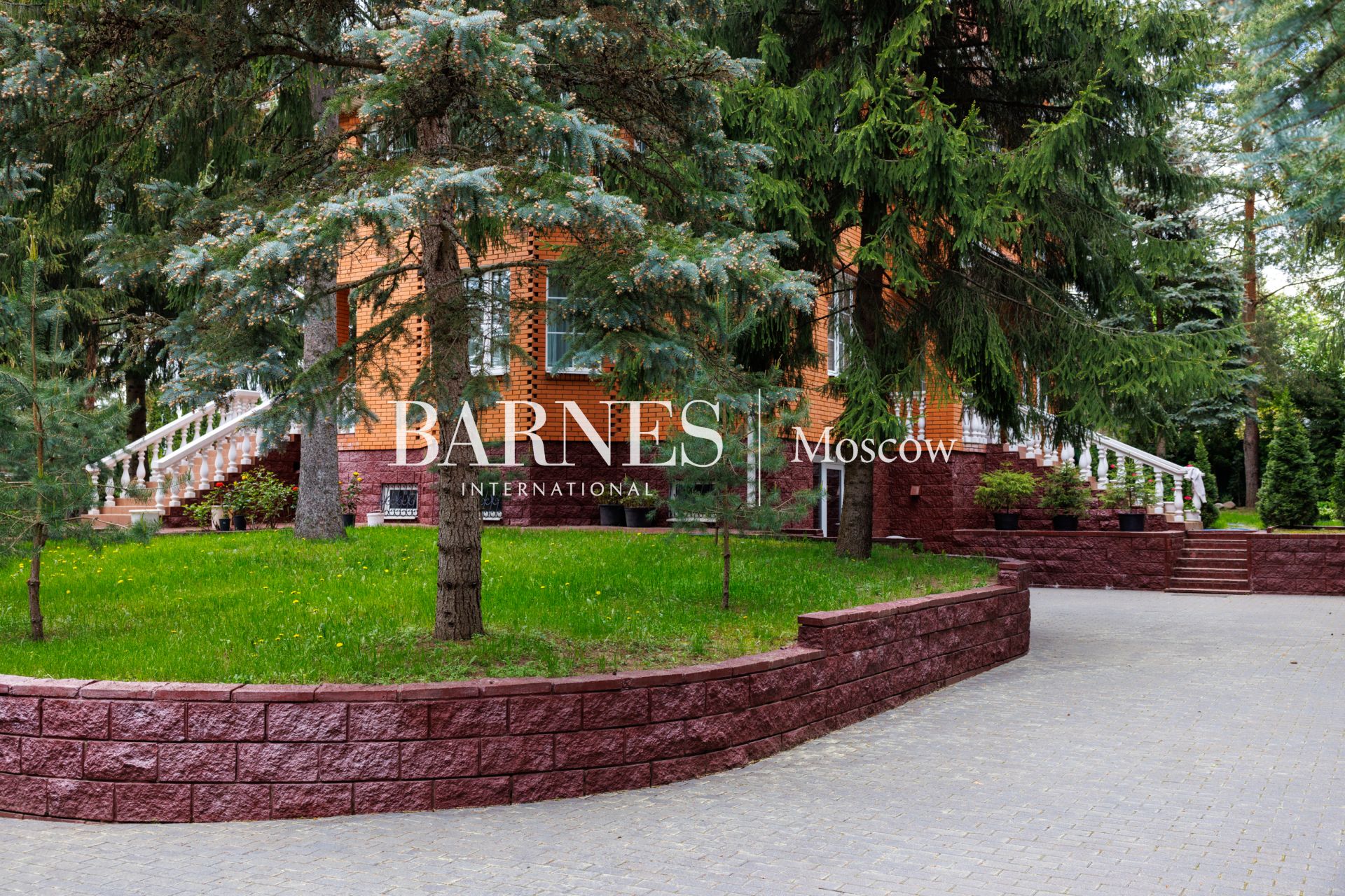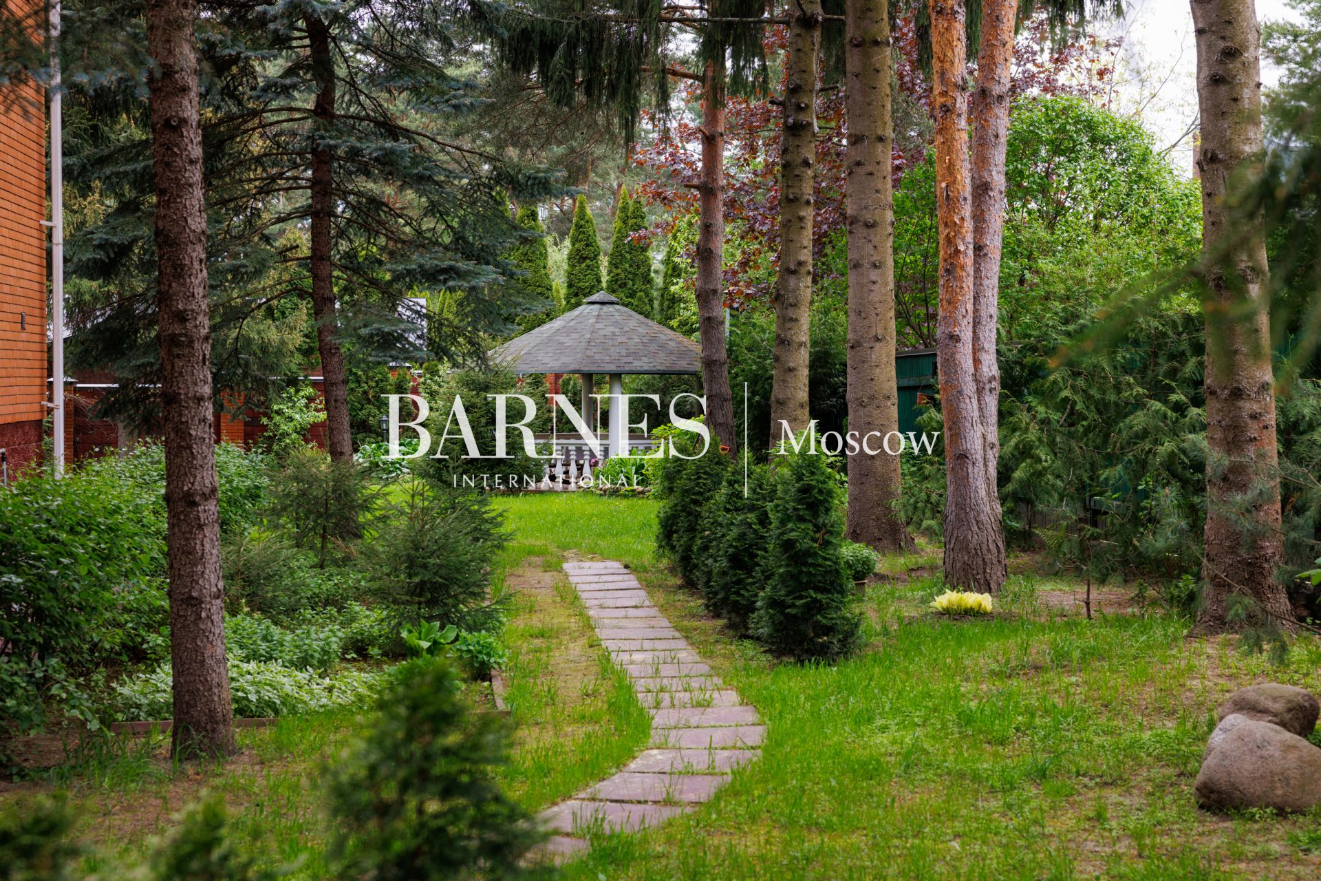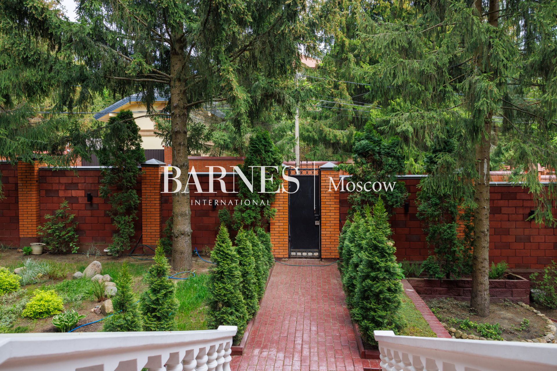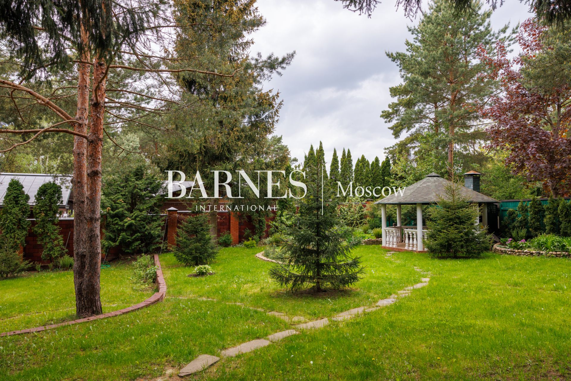 Участок приватный, с высоким забором, с множеством взрослых хвойных деревьев и ландшафтными работами: газон, дорожки, клумбы, декоративные насаждения.