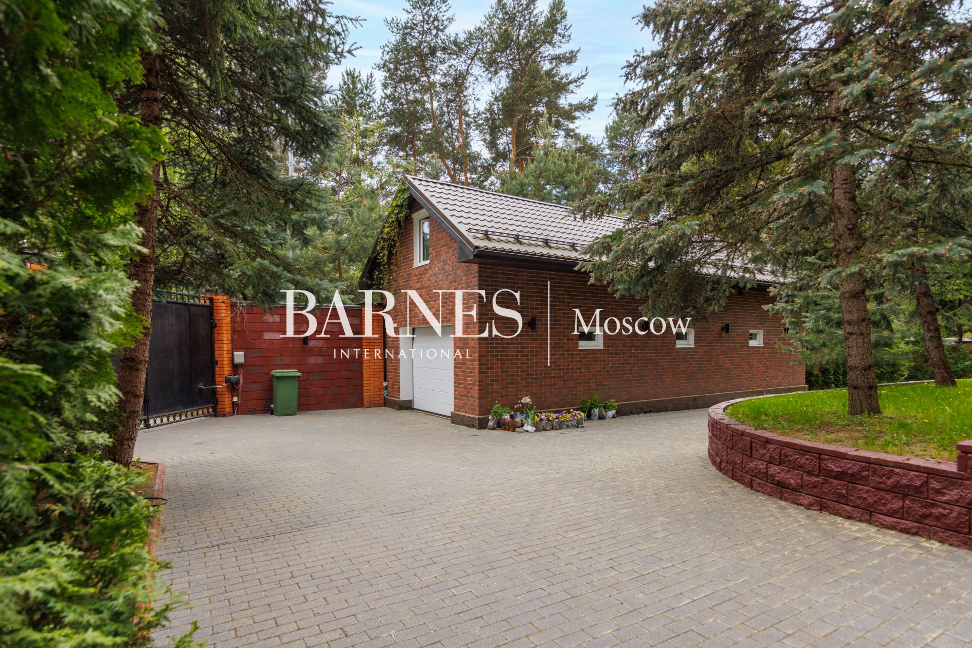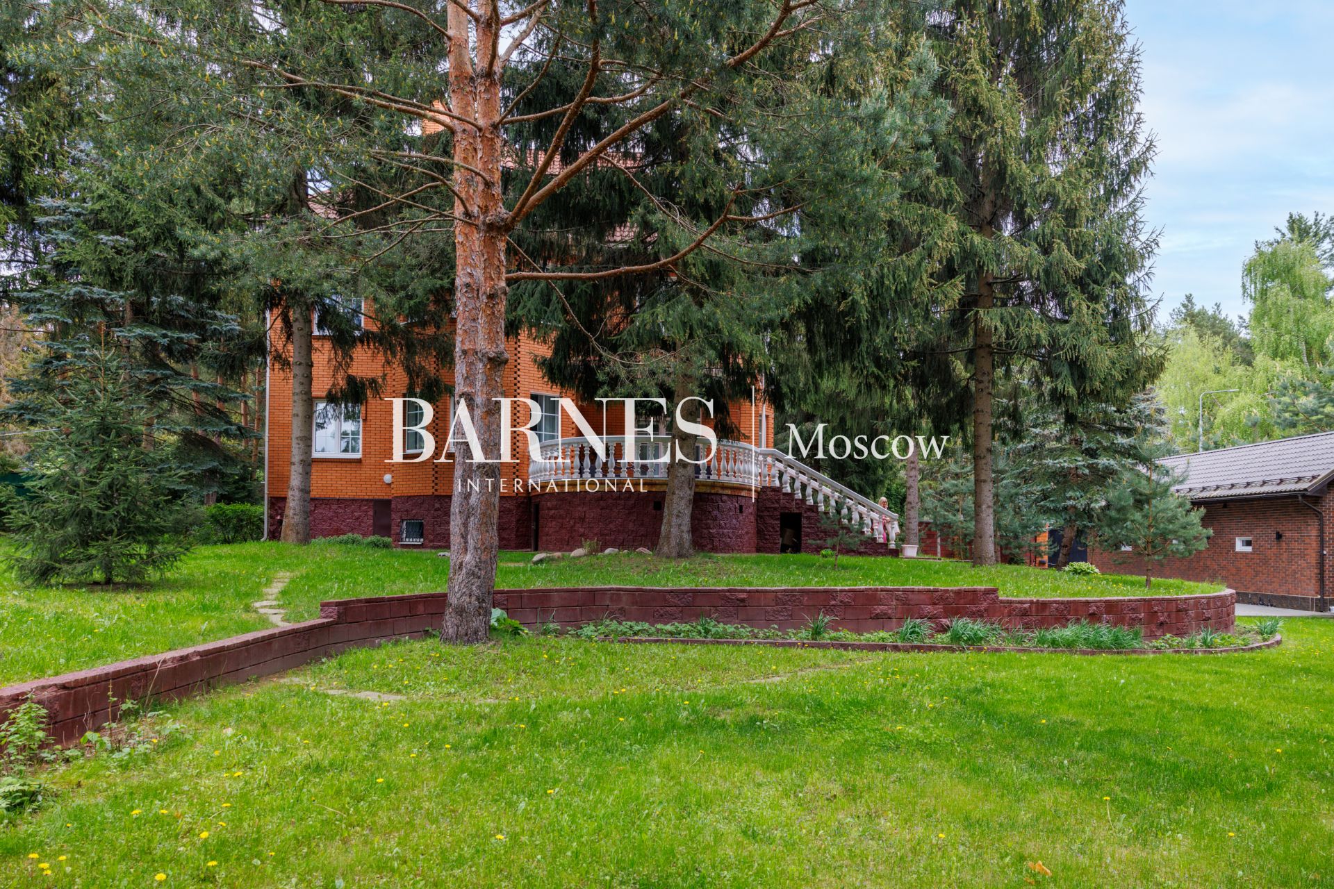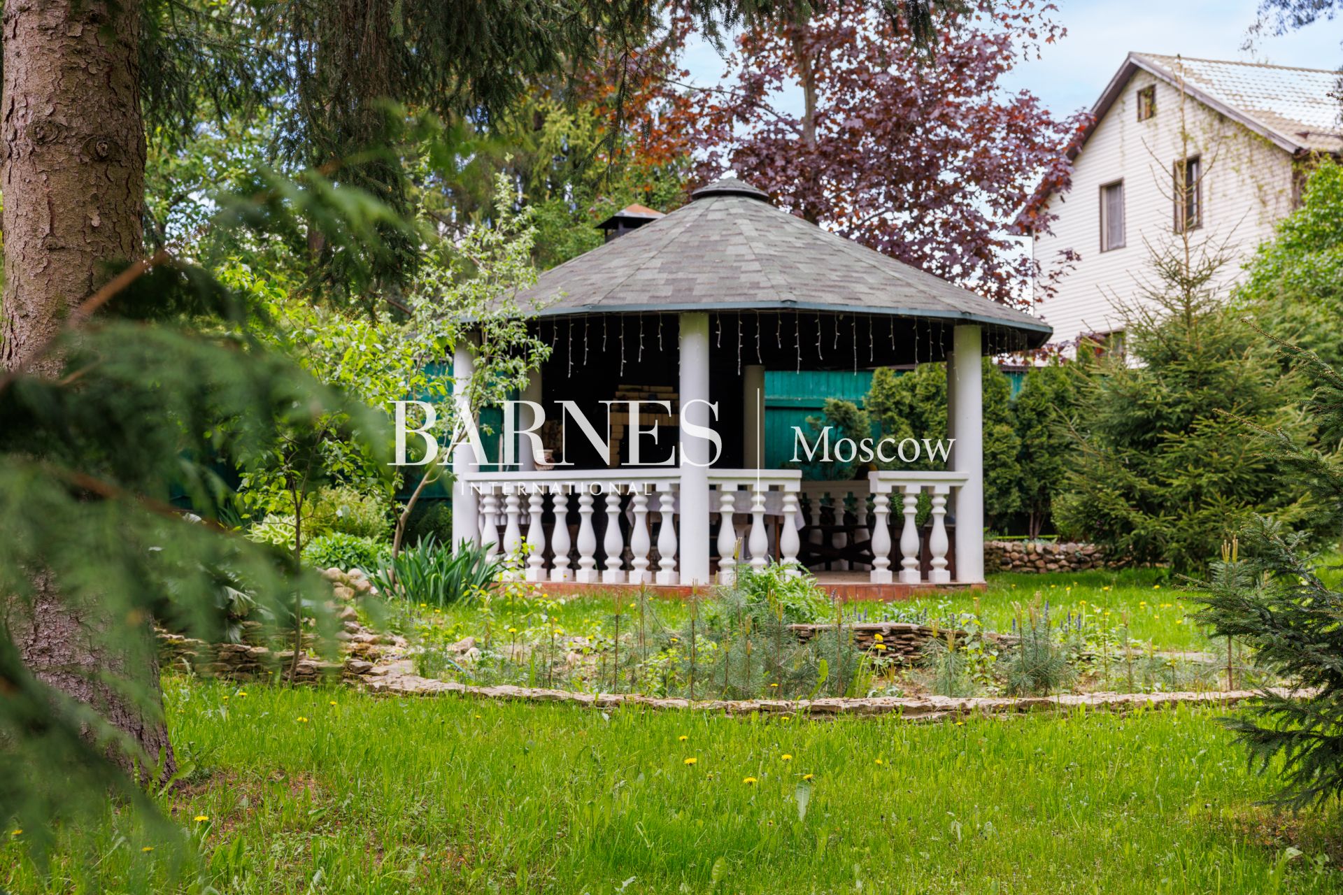 На участке летняя крытая беседка с барбекю, гараж на 2 м/м с мойкой, с квартирой для персонала (свой выход за периметр участка).