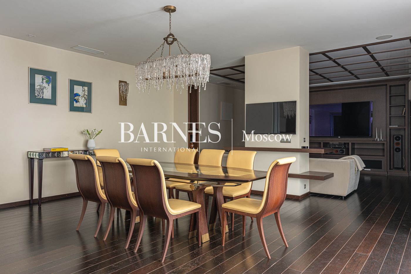 В квартире выполнена дизайнерская отделка по авторскому проекту. Планировочным решением предусмотрены: гостиная c встроенной итальянской акустической системой Zingali Acoustics и телевизором Loewe Reference, кухня, оборудованная техникой Miele, с обеденной зоной и гостевым залом, основная спальная с гардеробной, собственным санузлом и встроенной сауной, 2 детские, одна из которых с собственным санузлом, просторный холл с гостевым санузлом, прачечной и гардеробной, коридор с вместительными шкафами. Стена за кроватью в основной спальне изготовлена из натурального дерева и имеет скрытую гардеробную и огнестойкую сейфовую комнату из сверхпрочных материалов.