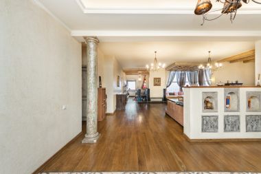 Квартира очень светлая. Великолепная функциональная планировка позволяет комфортно использовать всю площадь квартиры: просторная прихожая с коридором, большой холл, гостиная, кухня, столовая, возможность спланировать 4 спальни, 3 санузла, 4 лоджии.