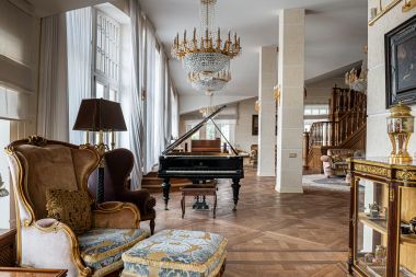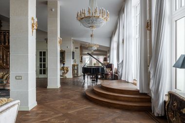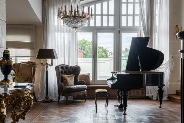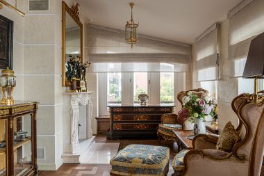 В квартире выполнена отдела с неоклассическом стиле. 1 уровень: гостиная с камином, библиотекой и выходом на большую террасу, кухня-столовая с малой террасой, 2 спальни, кабинет, 4 санузла. 2 уровень: гостиная зона, небольшая кухня, 2 спальни с санузлами и гардеробными.