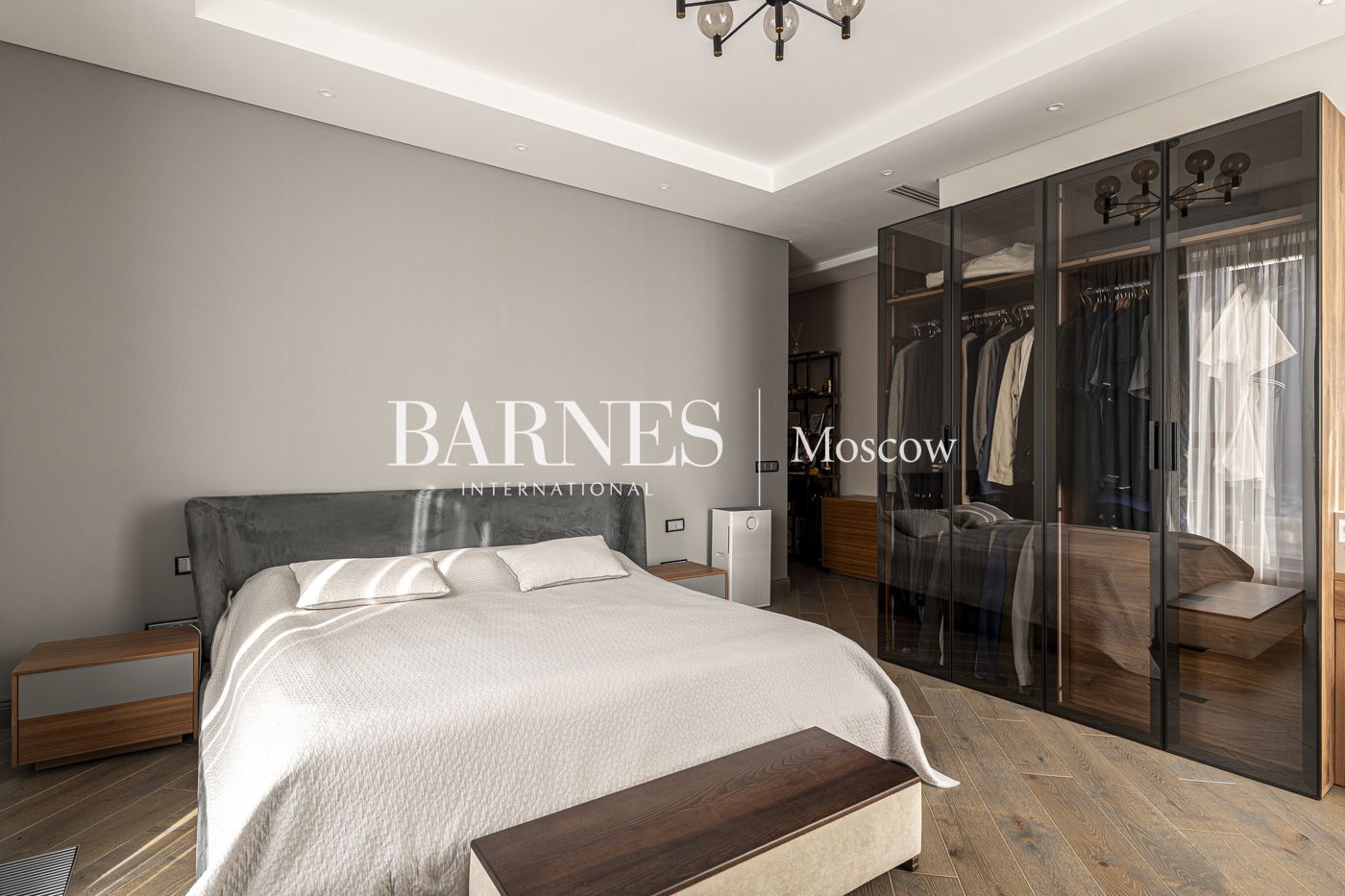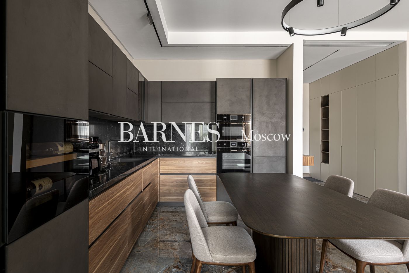 Интерьер выполнен в сдержанной современной эстетике с акцентом на качество и долговечность: встроенная кухня оснащена всей необходимой техникой, мебель подобрана в единой стилистике и соответствует высокому уровню.