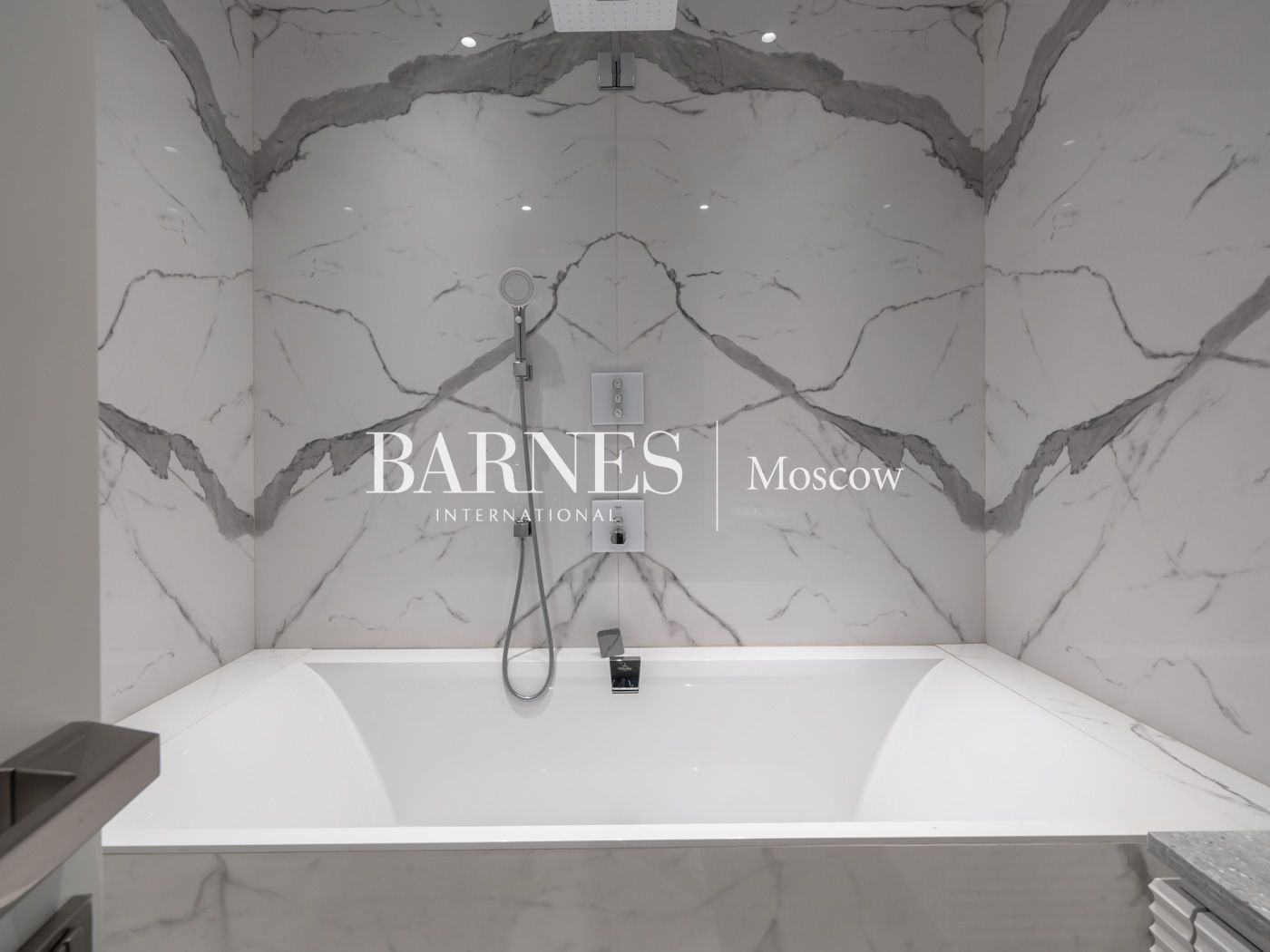 В отделке и оснащении квартиры использованы премиальные европейские бренды: изысканная сантехника Villeroy&Boch и встроенная кухонная техника Kuppersbusch. Каждая деталь подчеркивает безупречный стиль и комфорт. Высокие потолки и панорамные окна в пол наполняют интерьер естественным светом и визуально расширяют пространство, подчеркивая ощущение свободы и воздуха. Застекленная лоджия органично дополняет жилую площадь, становясь уютной лаундж-зоной.