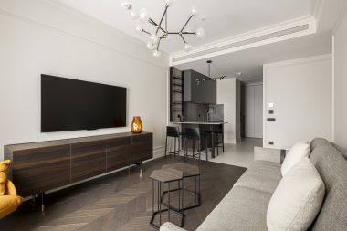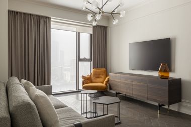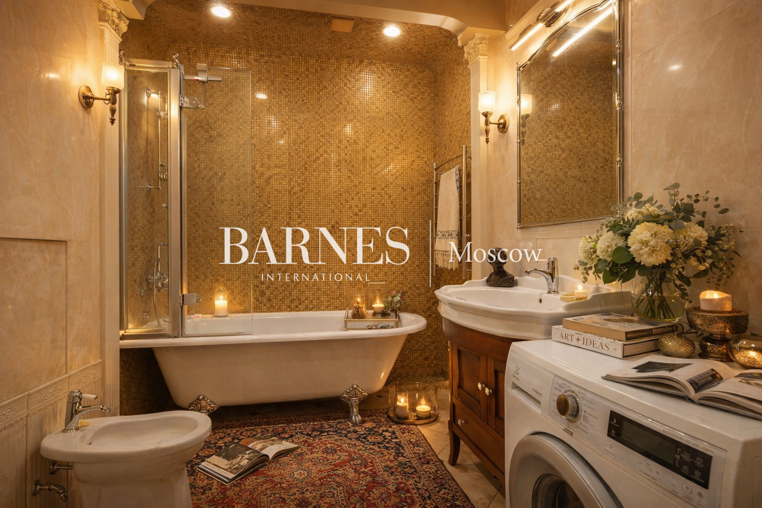 В квартире выполнена качественная отделка с использованием натуральных материалов. Удобное и функциональное планировочное решение: просторная гостиная с зонами столовой и кухни, спальня с гардеробной комнатой и совмещенным санузлом, гостевой санузел при входе, большая прихожая.