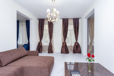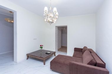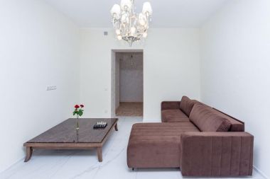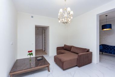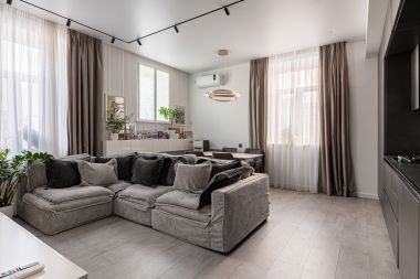 В квартире выполнена дизайнерская отделка по авторскому проекту. Функциональное планировочное решение: просторная гостиная с зоной кухни-столовой, 2 спальни, кабинет (при желании может быть переоборудован в третью спальню), 2 гардеробные, 2 санузла.