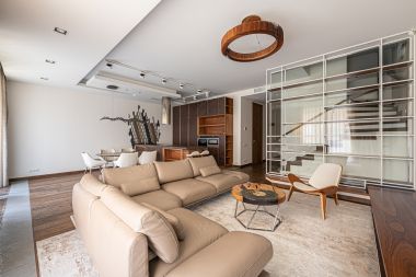 Отделка квартиры выполнена в классическом стиле. Планировочным решением предусмотрены: просторная гостиная-столовая с зоной кухни, 3 спальни, 3 гардеробные, 4 санузла.