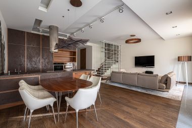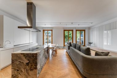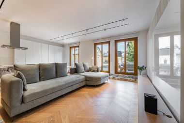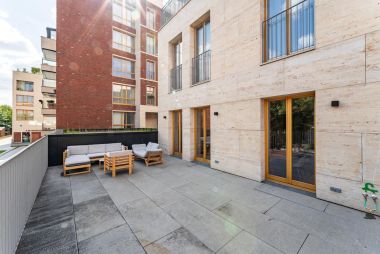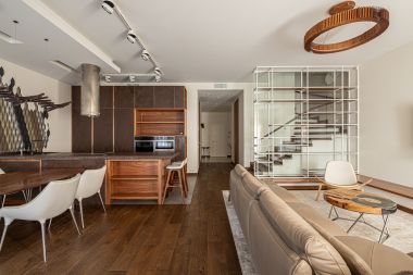 В квартире много окон, обеспечивающих естественное освещение. Высокие потолки, установлена система кондиционирования.