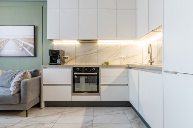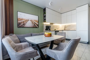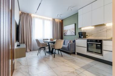 Просторная кухня-гостиная площадью 30 квадратных метров разделена на обеденную зону и зону отдыха, где комфортно собираться для отдыха всей семьей, или можно с удобством разместить гостей. Установлен кондиционер. Коридор разделяет квартиру на зоны спален, кухни-гостиной и санузлов. Два санузла, один для удобства с большой душевой кабиной, установлен бойлер.