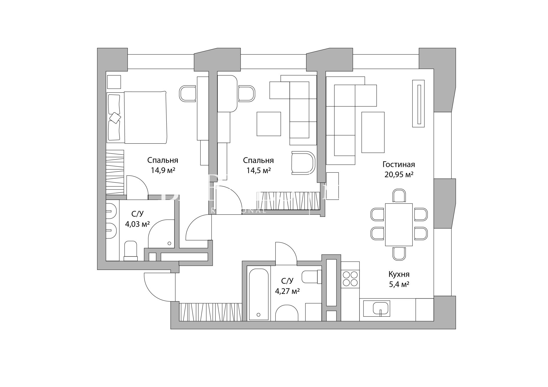 В квартире выполнена предчистовая отделка Whitebox. Функциональное планировочное решение: просторная гостиная с зоной кухни, 2 спальни, 2 санузла, прихожая.