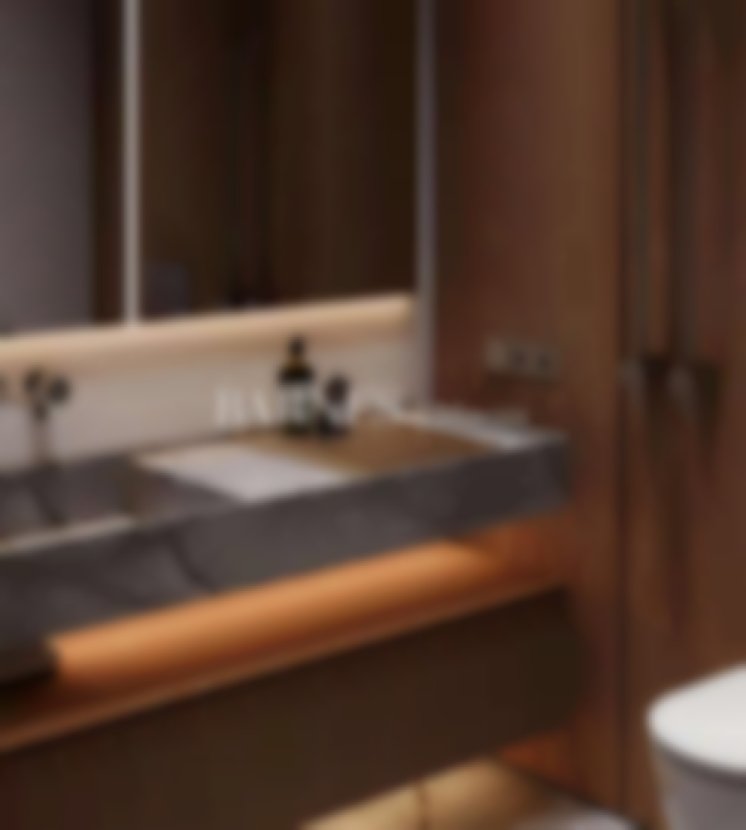 В отделке использованы высококачественные и натуральные материалы: натуральный мрамор, шпон дуба, сатинированная сталь, декоративная штукатурка.