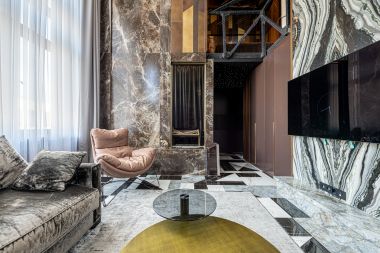 В квартире выполнена современная авторская отделка с использованием натуральных материалов: мрамор, гранит, дерево. Планировочным решением предусмотрены: просторная гостиная с зоной кухни, спальня, кабинет / детская, 2 санузла.