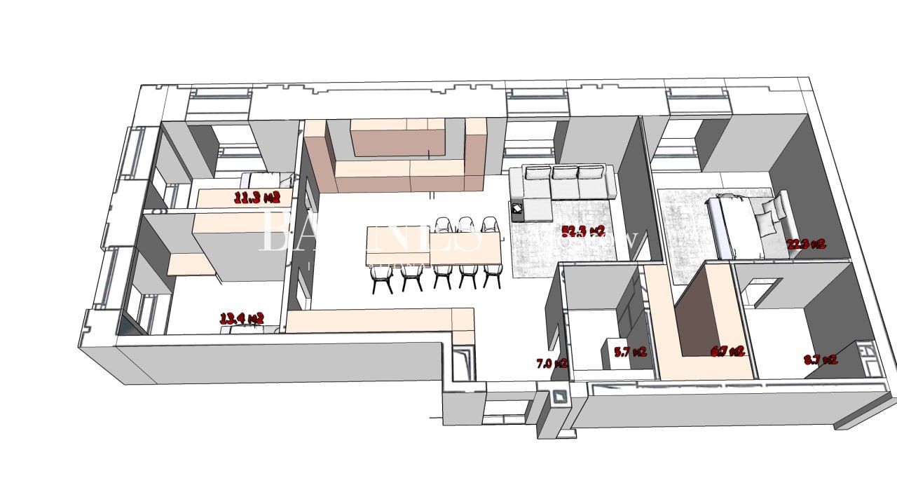 Квартира без отделки с возможностью разместить: просторную гостиную-столовую с зоной кухни, 3 спальни, 2 санузла, гардеробную, прихожую с гардеробной зоной.