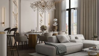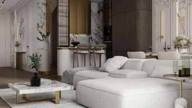 Вся мебель в квартире изготовлена по индивидуальному заказу и привезена из Италии, диван и кресла в гостиной представлены от Armani.