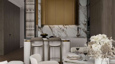 Итальянская кухня укомплектована всей необходимой техникой Gaggenau (духовой шкаф, варочная панель, микроволновая печь, посудомоечная машина, холодильник), винный шкаф EuroCave. Пол в коридоре и на кухне с подогревом - натуральный мрамор, американский паркет - массив ореха, стены - натуральная кожа и шелк. Раковина в мастер-санузле выполнена из оникса, сантехника Villeroy & Boch, Washlet. Постирочная оборудована стиральной и сушильной машинами Miele.