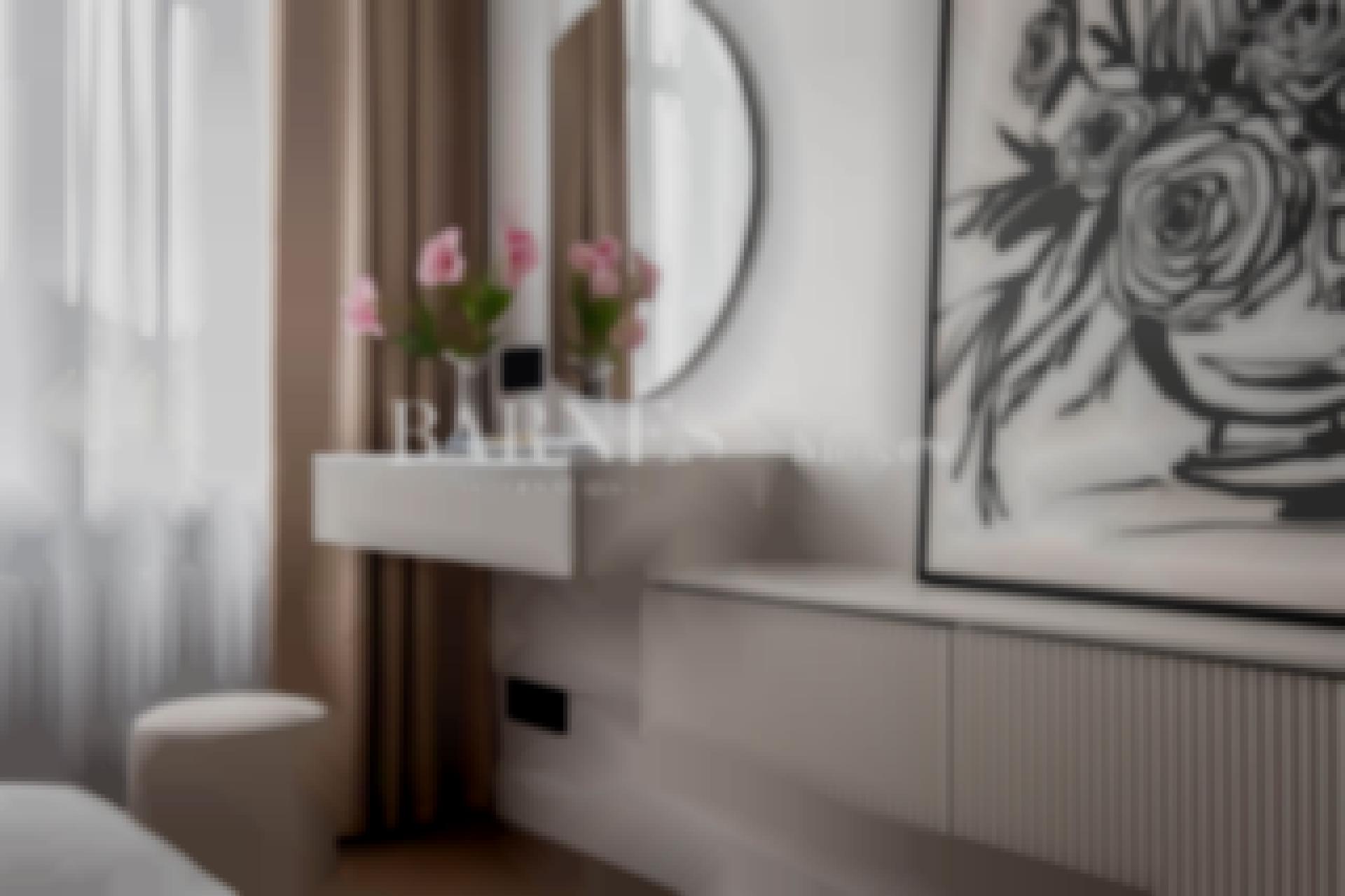 В квартире выполнена дизайнерская отделка в неоклассическом стиле с заменой всех коммуникаций. Функциональное планировочное решение: просторная гостиная-столовая с зоной кухни, спальня, кабинет, санузел, прихожая с гардеробной зоной.