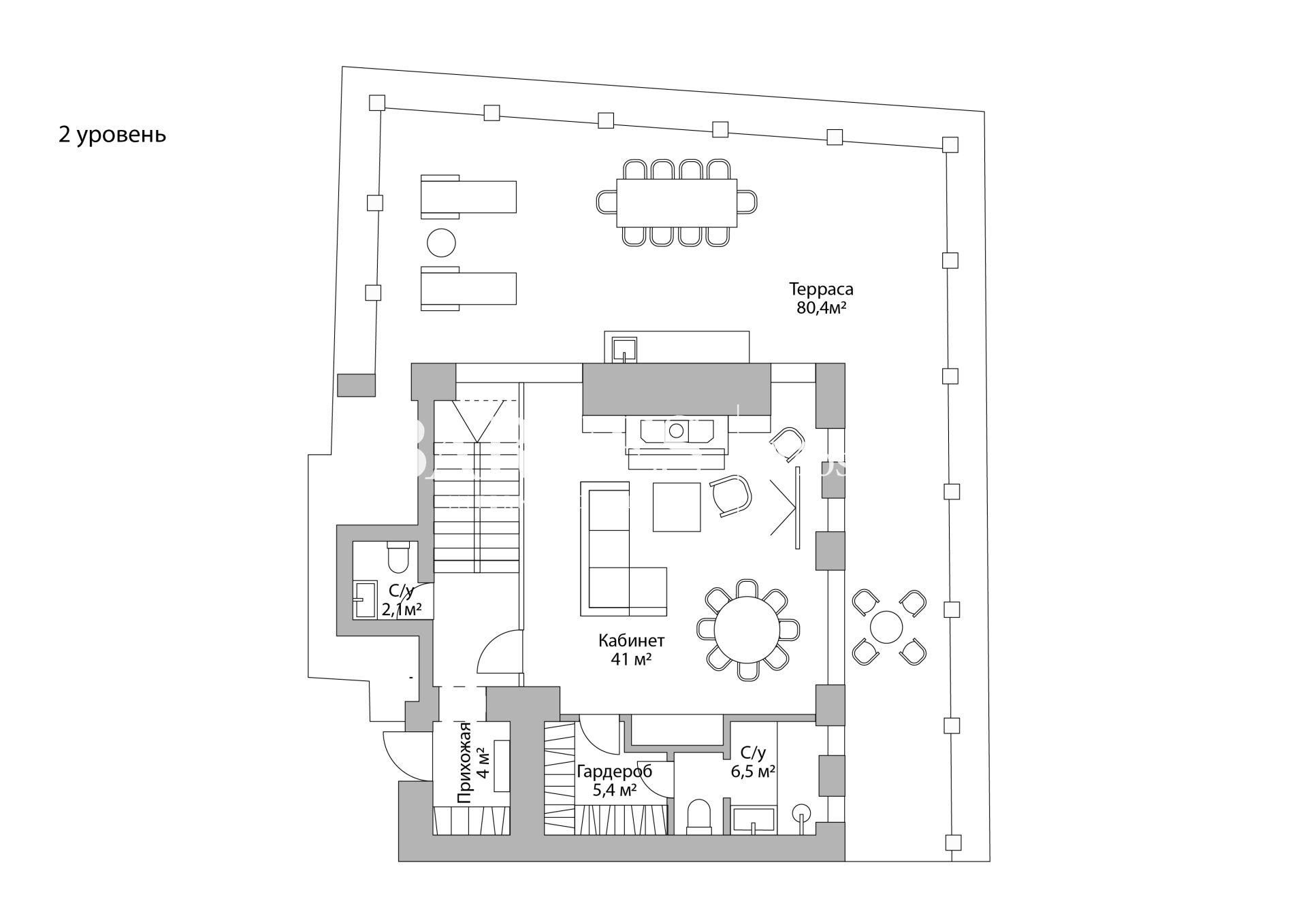 Планировочное решение: 1 уровень – просторная гостиная, кухня-столовая, мастер-спальня с гардеробной и ванной комнатой, детская спальня с ванной комнатой, гостевая спальня с ванной комнатой, гардеробные, постирочная, холл; 2 уровень – кабинет с ванной комнатой, гардеробной и выходом на огромную террасу площадью 80.4 кв.м, гостевой санузел, прихожая с гардеробом.