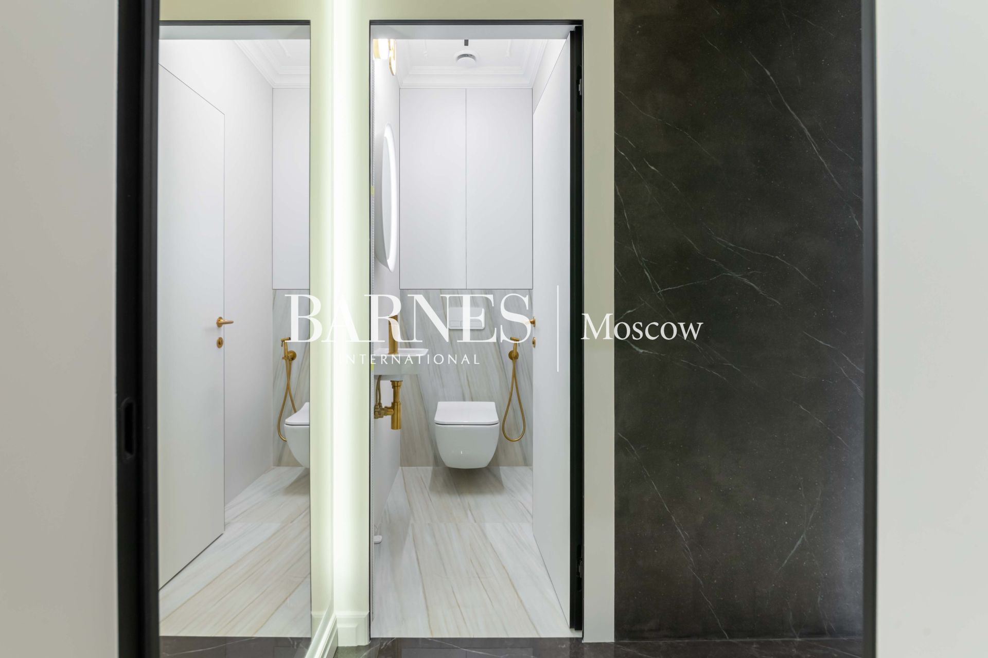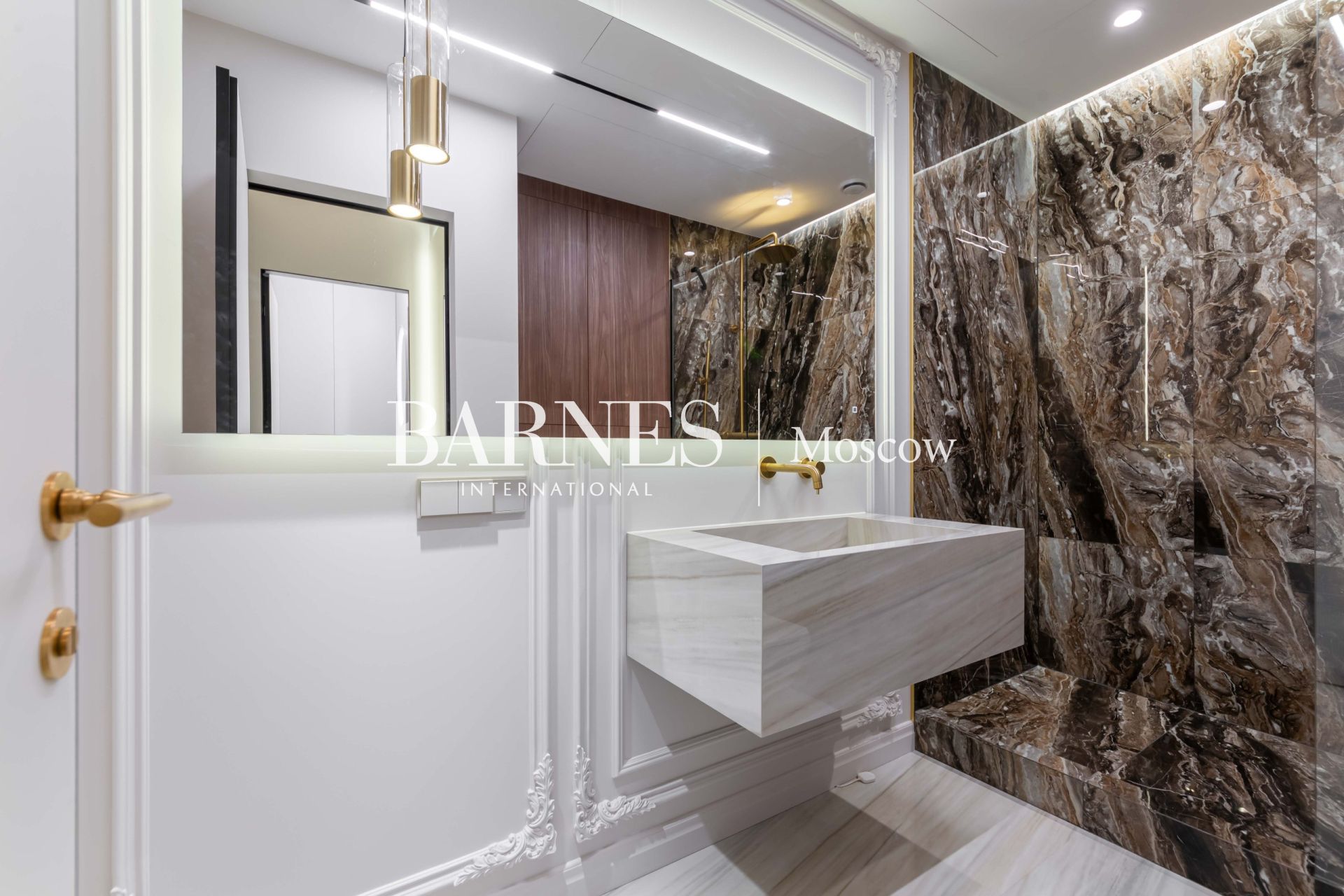 ◦ Латунные вставки: Элементы из натуральной латуни на полу и стенах подчеркивают статусность интерьера.