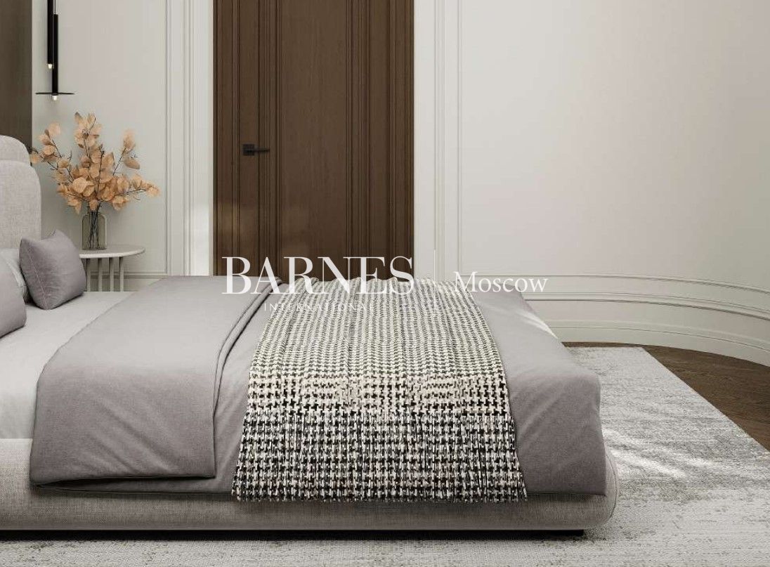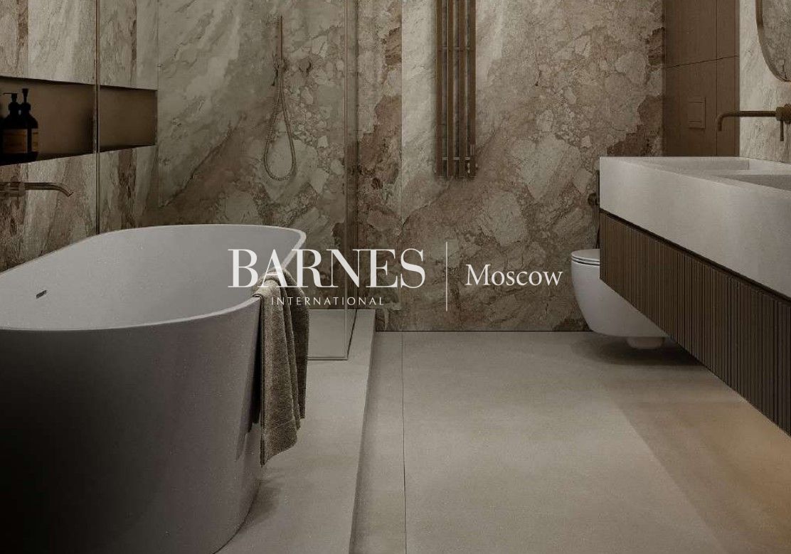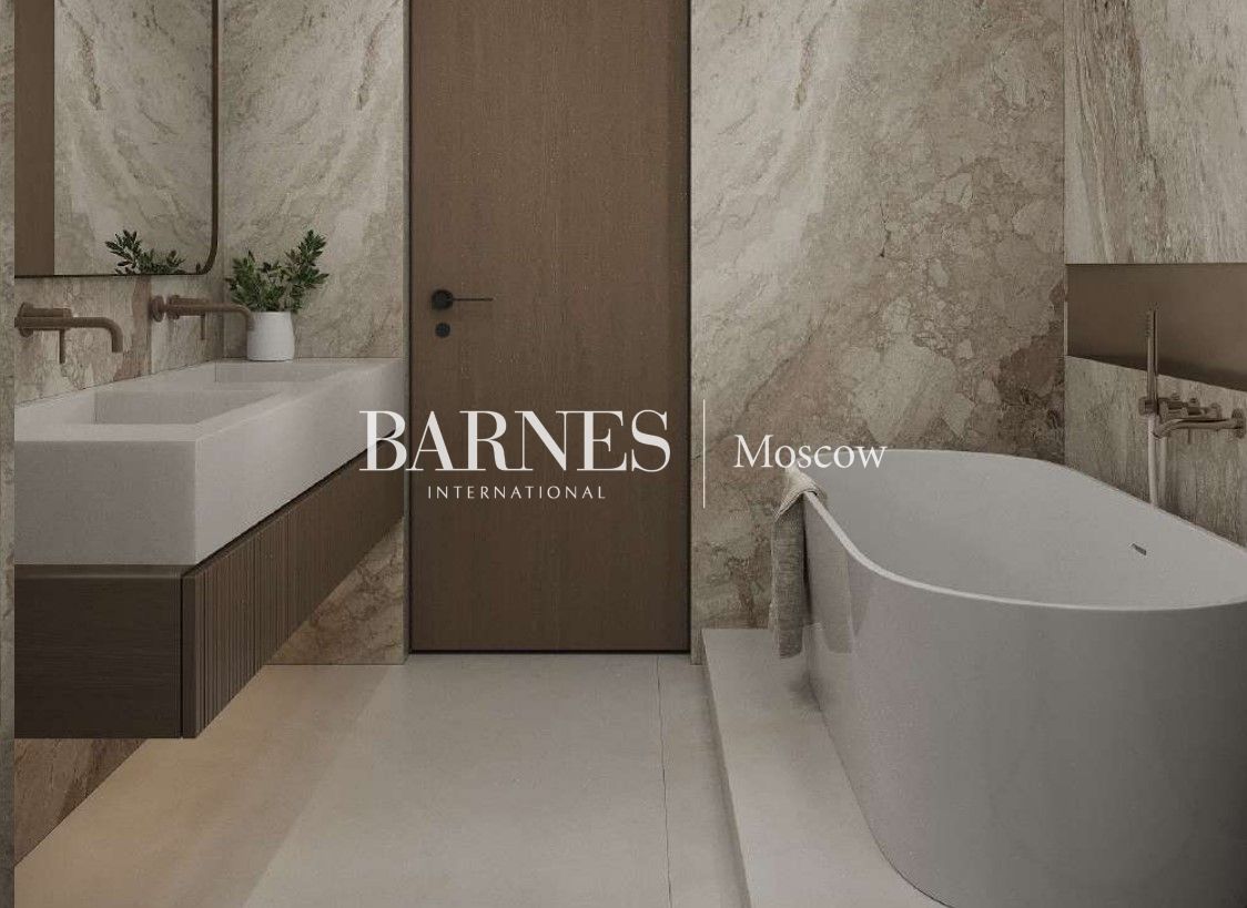 Авторская отделка с использованием премиальных материалов. Планировочное решение: просторная гостиная-столовая с зоной кухни, мастер-спальня с гардеробной и ванной комнатой, вторая спальня с гардеробной, кабинет, гостевой санузел, постирочная, прихожая с гардеробной. Кухня из шпона и эмали, выполненная на заказ, укомплектована техникой Miele и Asko.