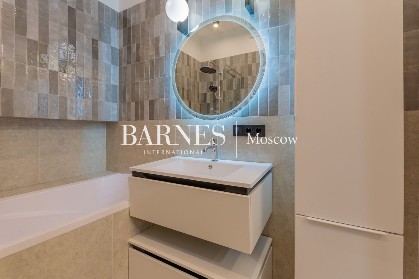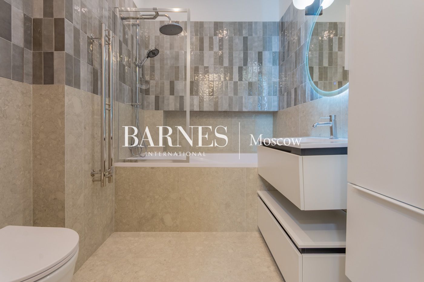Ванна из искусственного камня SТWОRКI 180*80, стеклянная шторка Vinсеа Сity, керамическая плитка Еquiре Аrtisаn и керамогранит IDАLGО, унитаз ВеlВаgnо, смесители SТWОRКI, электрический полотенцесушитель Соmfysаn, зеркало с подсветкой, раковина, тумба и пенал Сеzаrеs.