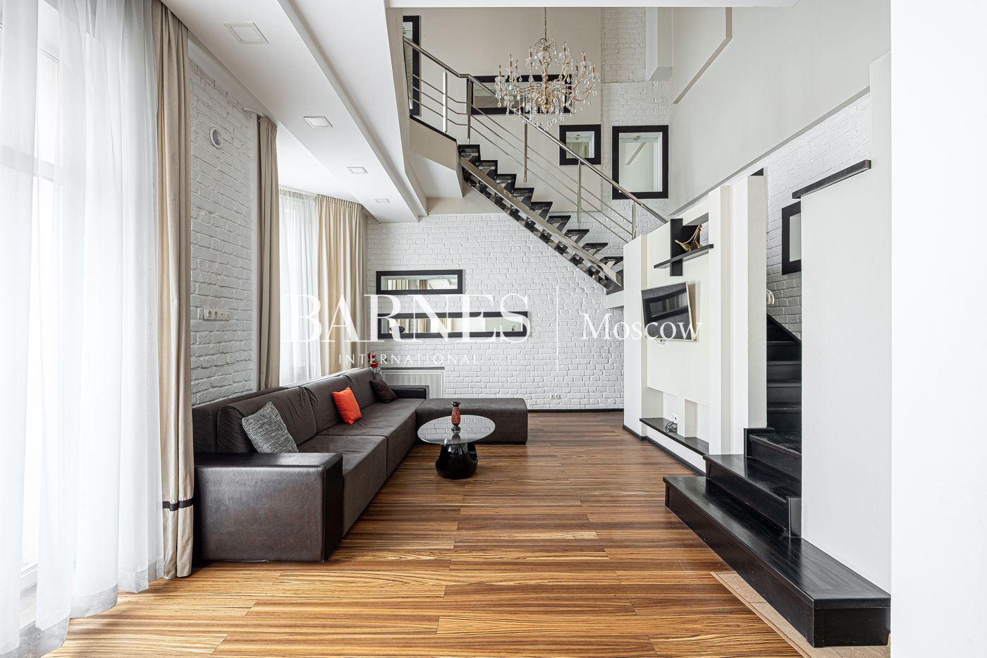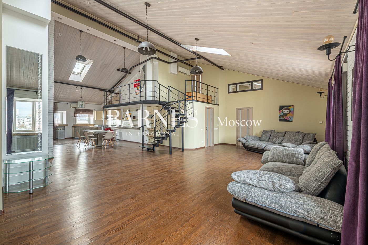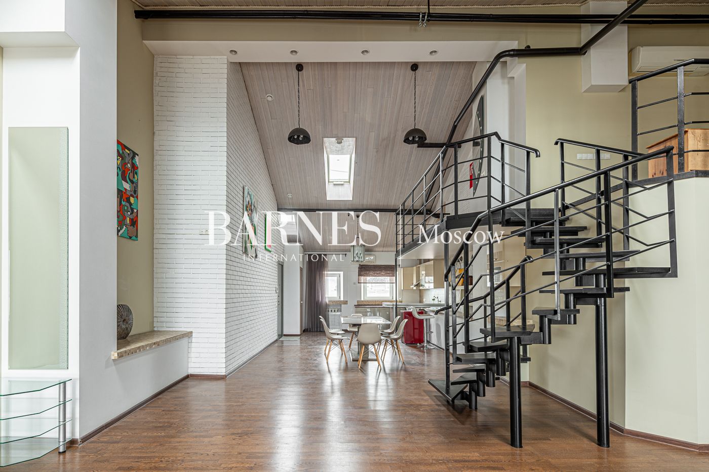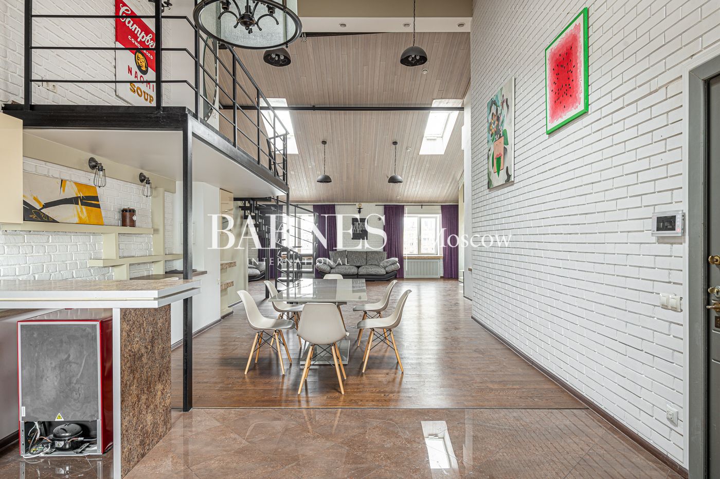 Квартира имеет два уровня и мансарду, а также второй свет высотой более 8 метров, лоджию и французские балконы, с которых открываются виды на историческую часть Москвы.