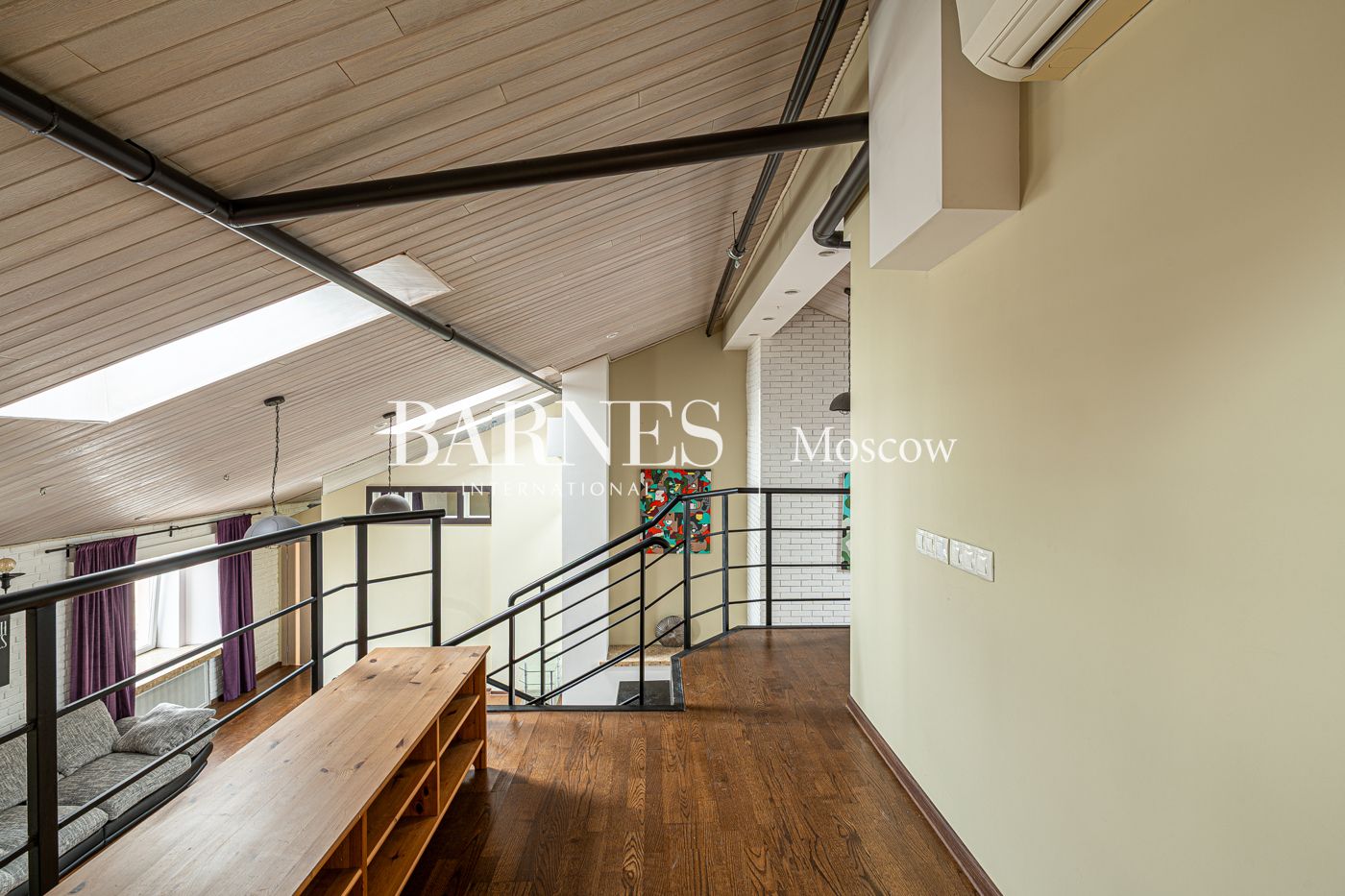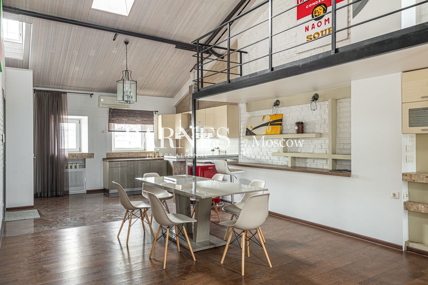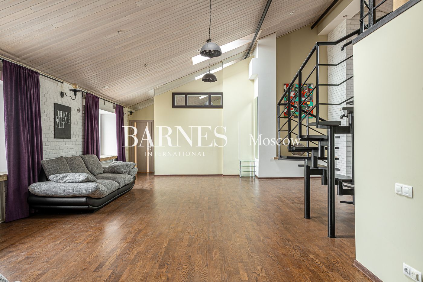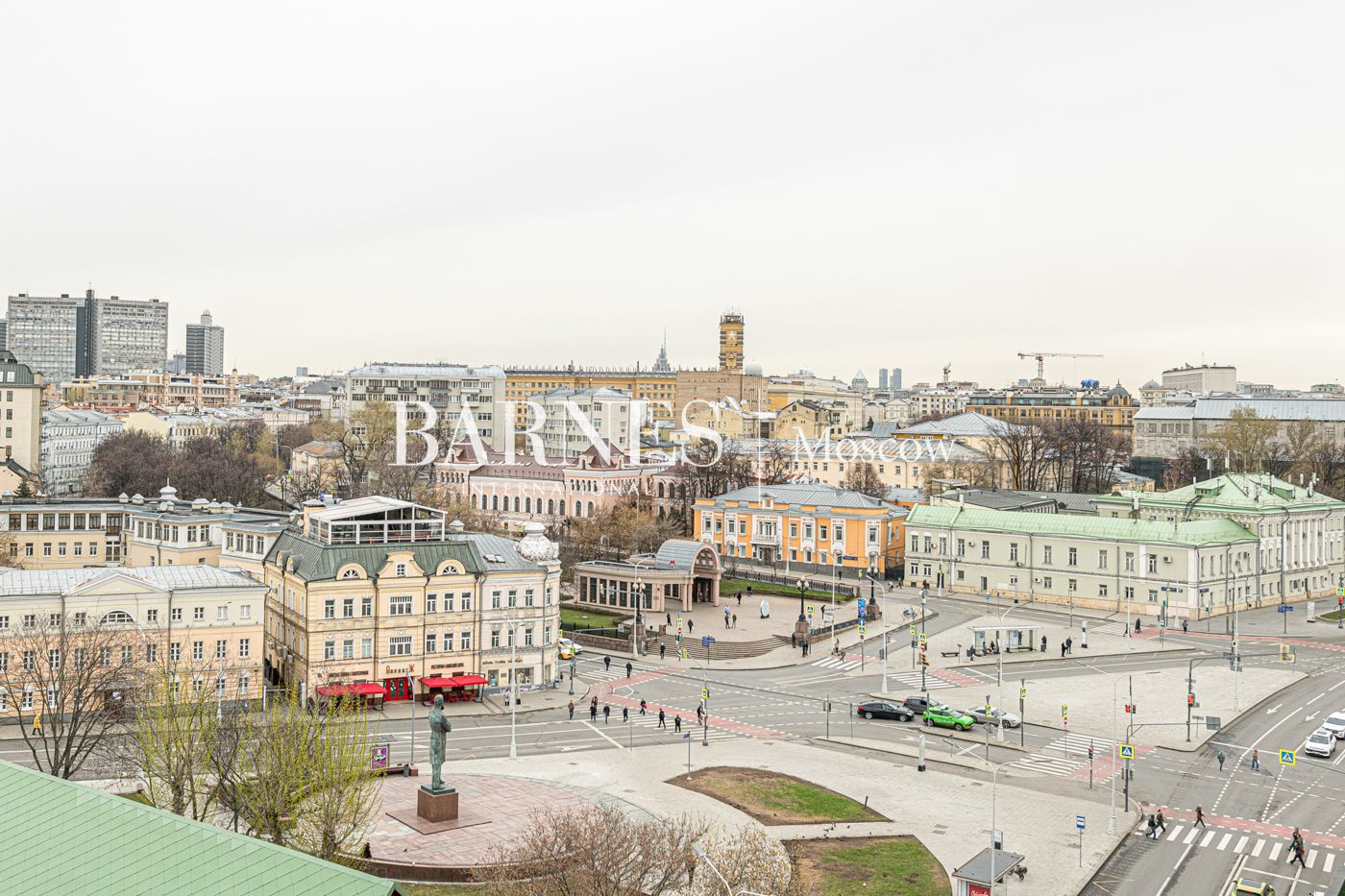 Квартира имеет два уровня и мансарду, а также второй свет высотой более 8 метров, лоджию и французские балконы, с которых открываются виды на историческую часть Москвы.