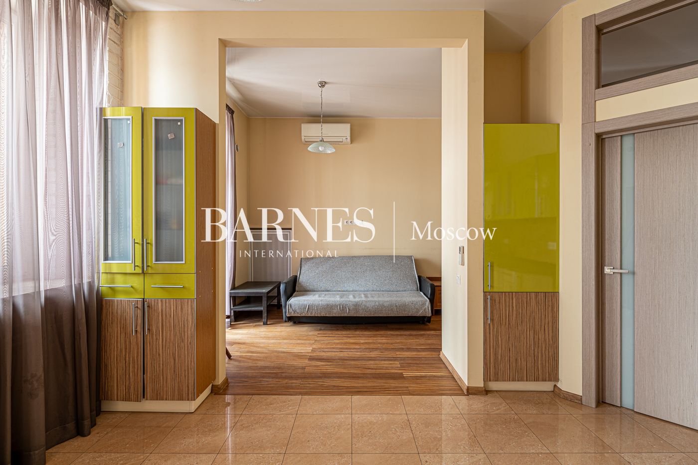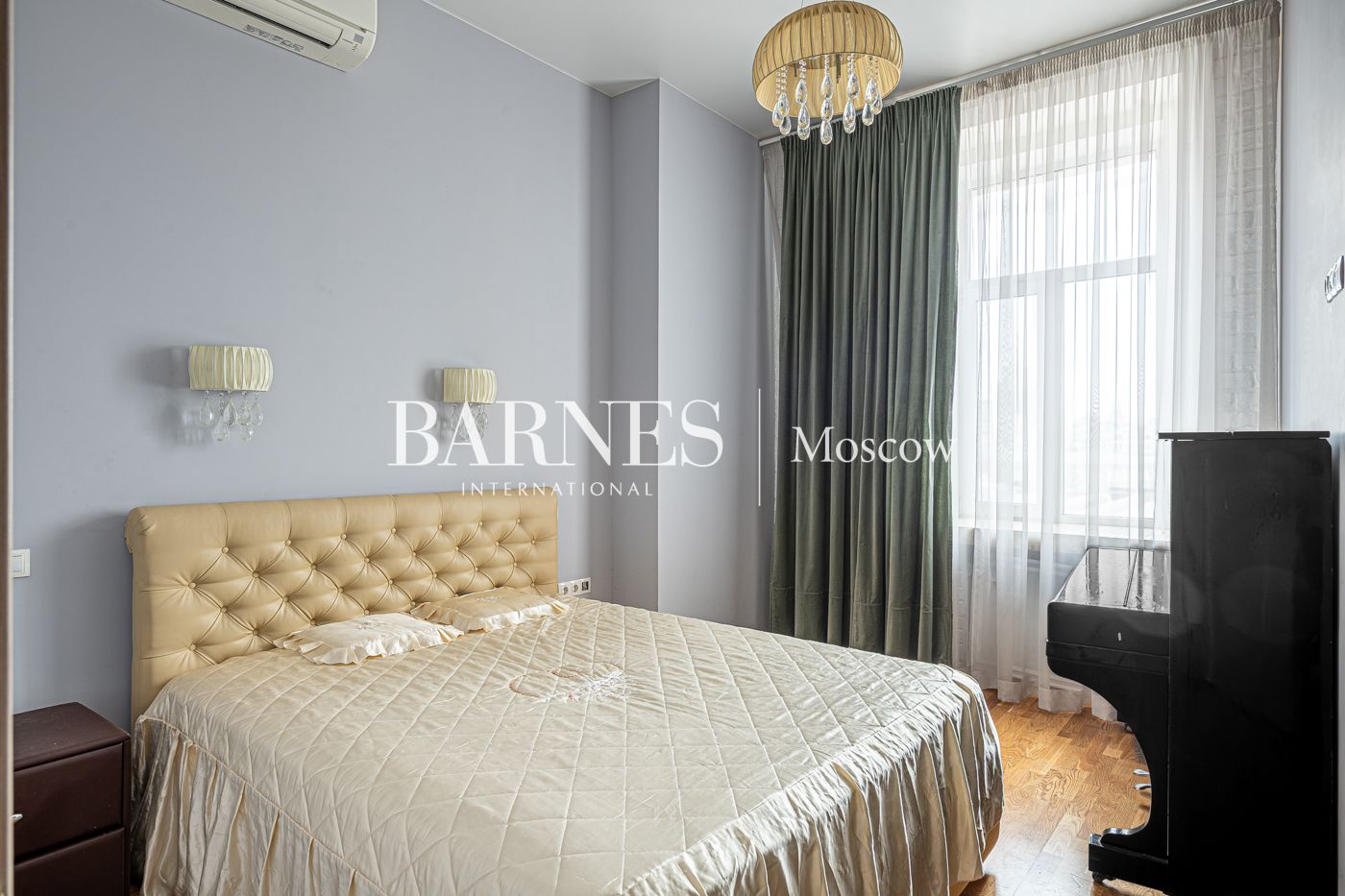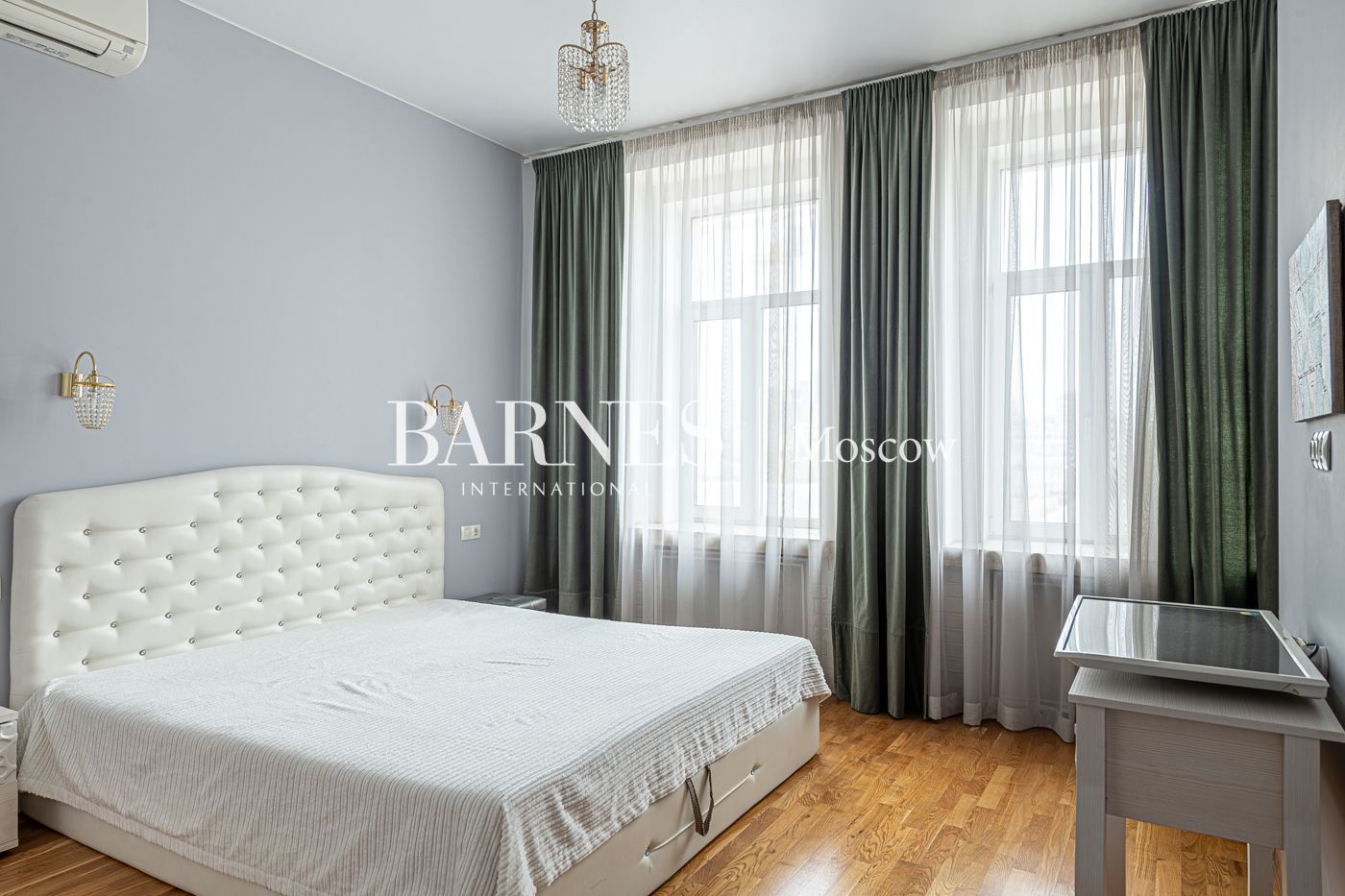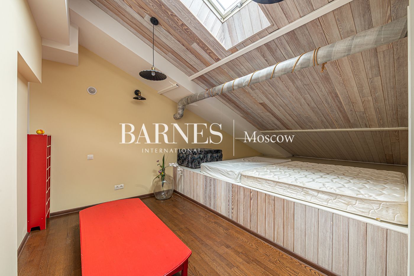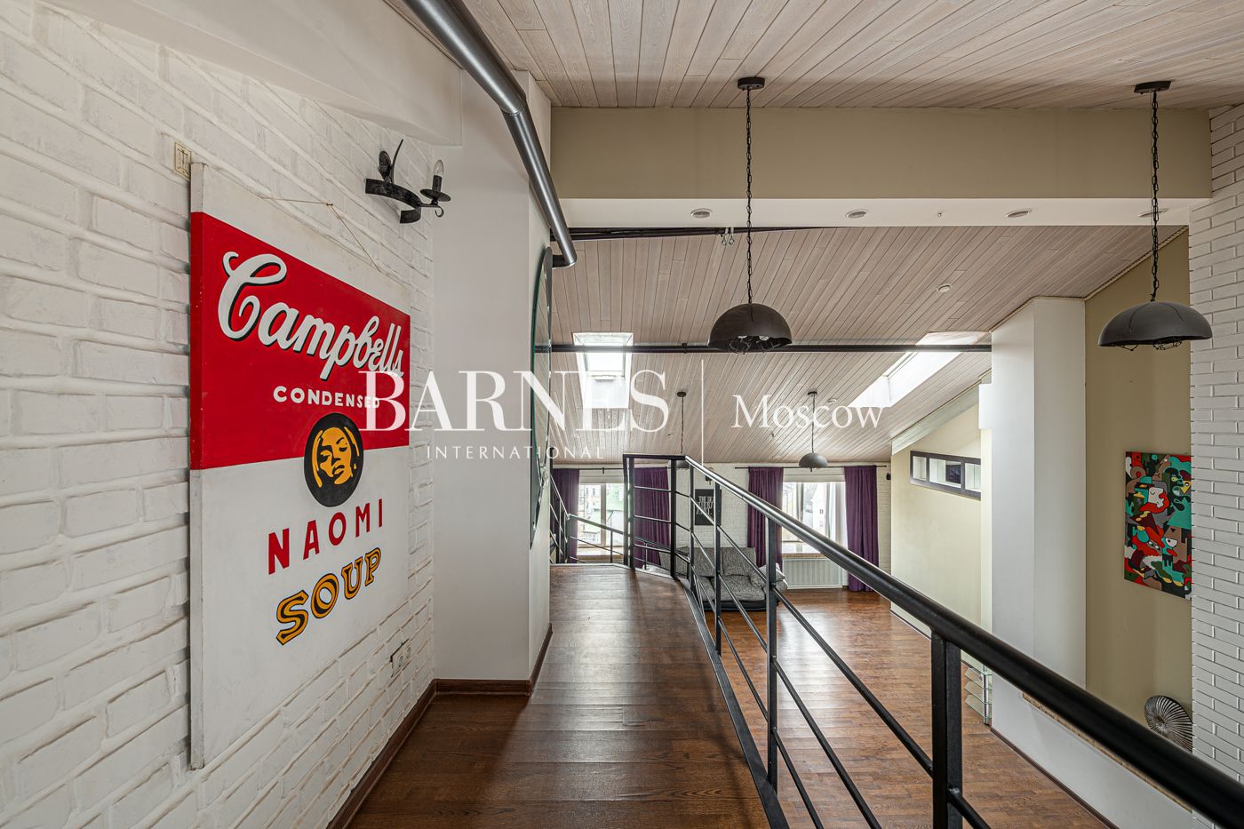 Квартира имеет два уровня и мансарду, а также второй свет высотой более 8 метров, лоджию и французские балконы, с которых открываются виды на историческую часть Москвы.