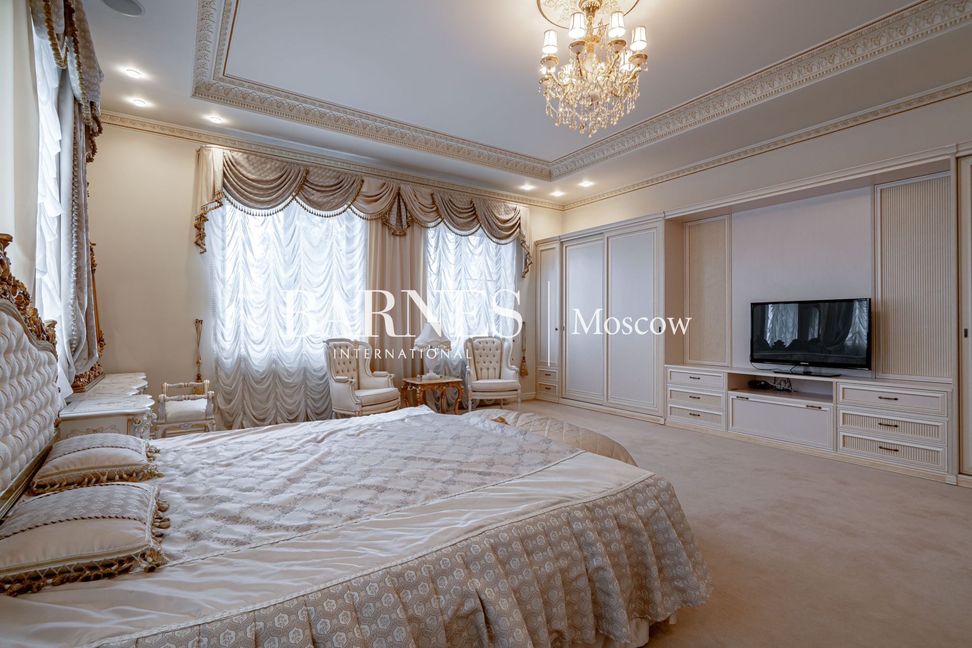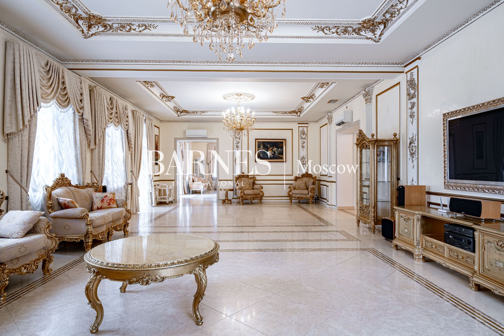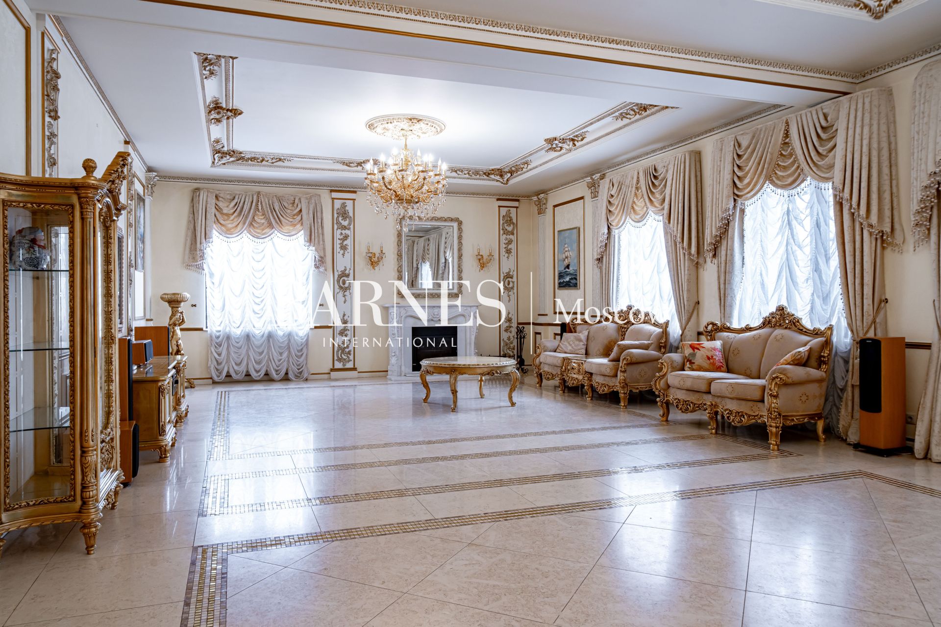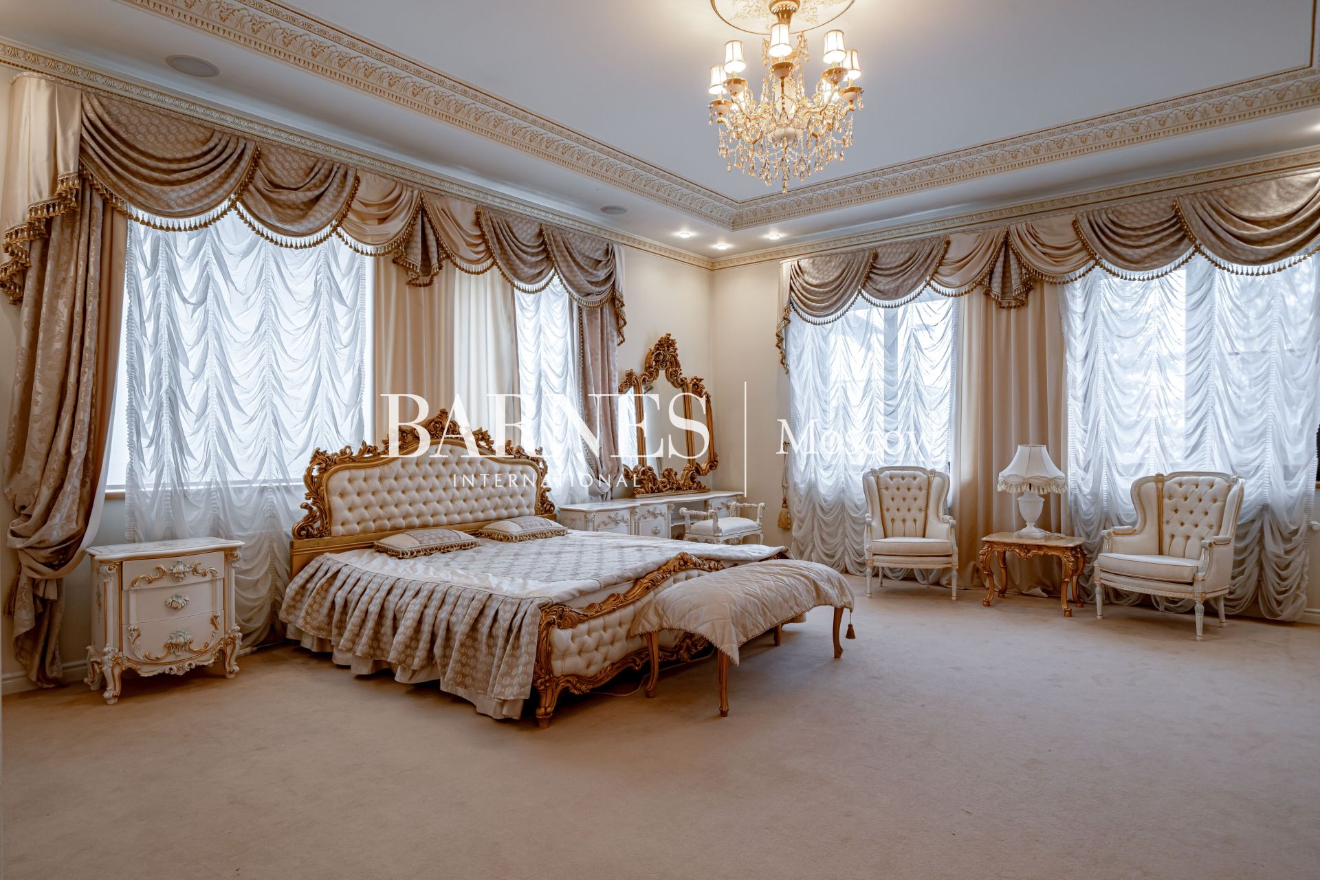 Внешний вид и интерьеры выполнены в классическом стиле. Удобная планировка включает в себя камин на дровах, полы из мрамора с золотой мозаикой и подогревом, кинозал, массажный кабинет, 4 ванные комнаты, 7 спальных комнат и гардеробную.